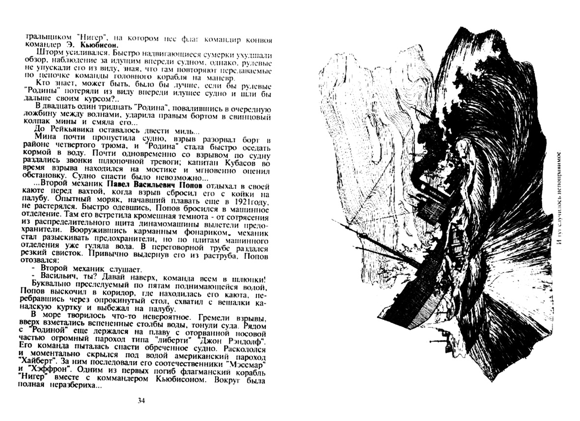 ...Второй механик Павел Васильевич Попов отдыхал в своей каюте перед вахтой, когда взрыв сбросил его с койки на палубу. Опытный моряк, начавший плавать еще в 1921 году, не растерялся. Быстро одевшись, Попов бросился в машинное отделение. Там его встретила кромешная темнота - от сотрясения из распределительного щита динамомашины вылетели предо хранители. Вооружившись карманным фонариком, механик стал разыскивать предохранители, но по плитам машинного отделения уже гуляла вода. В переговорной трубе раздался резкий свисток. Привычно выдернув его из раструба. Попов отозвался: