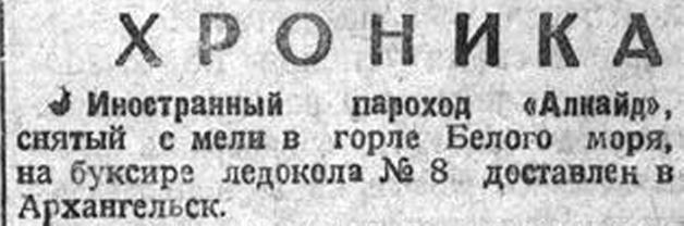КОМПАНИЯ «ВАН НИВЕЛЬТ» из Роттердама прислала в Архангельск телеграмму, относящуюся к судьбе голландского парохода "Алкайд". Владельцы судна отказались от прав на "Алкайд" в пользу спасателя.