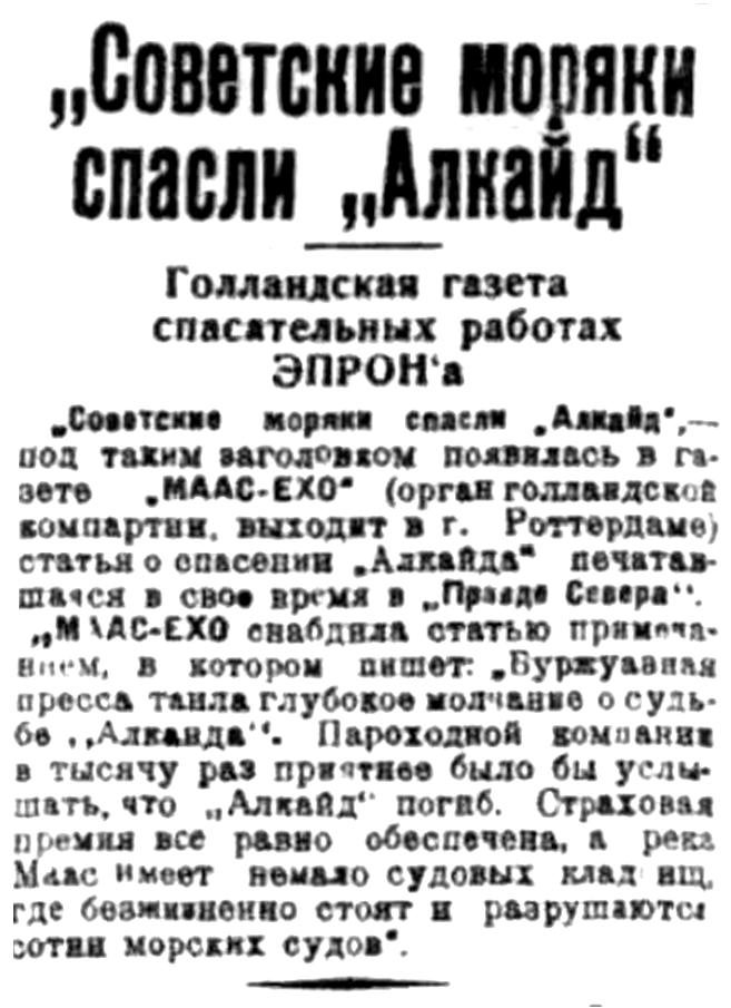 "Советские моряки спасли "Алкайд" — под таким заголовком появилась в газете "МААС-ЕХО" (орган голландской компартии, выходит в г. Роттердаме) статья о спасении "Алкайда" печатавшаяся в свое время в "Правде Севера". "МААС-ЕХО" снабдила статью примечанием, в котором пишет: "Буржуазная пресса таила глубокое молчание о судьбе "Алкайда". Пароходной компании в тысячу раз приятнее было бы услышать, что "Алкайд" погиб. Страховая премия все равно обеспечена, а река Маас имеет немало судовых кладбищ, где безжизненно стоят и разрушаются сотни морских судов".