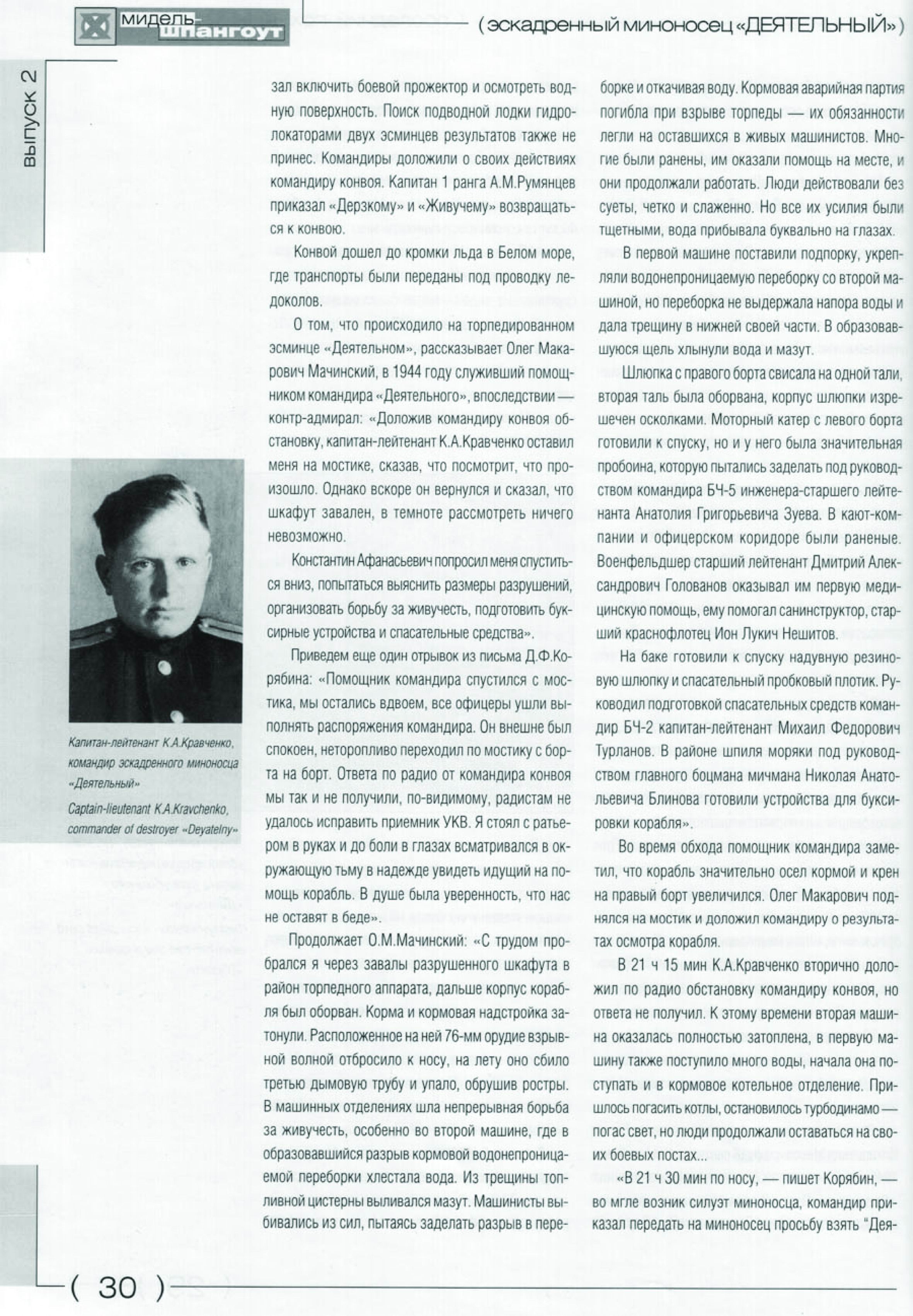 О том, что происходило на торпедированном эсминце "Деятельном", рассказывает Олег Макарович Мачинский, в 1944 году служивший помощником командира «Деятельного», впоследствии контр-адмирал: «Доложив командиру конвоя обстановку, капитан-лейтенант К. А. Кравченко оставил меня на мостике, сказав, что посмотрит, что произошло. Однако вскоре он вернулся и сказал, что шкафут завален, в темноте рассмотреть ничего невозможно.
