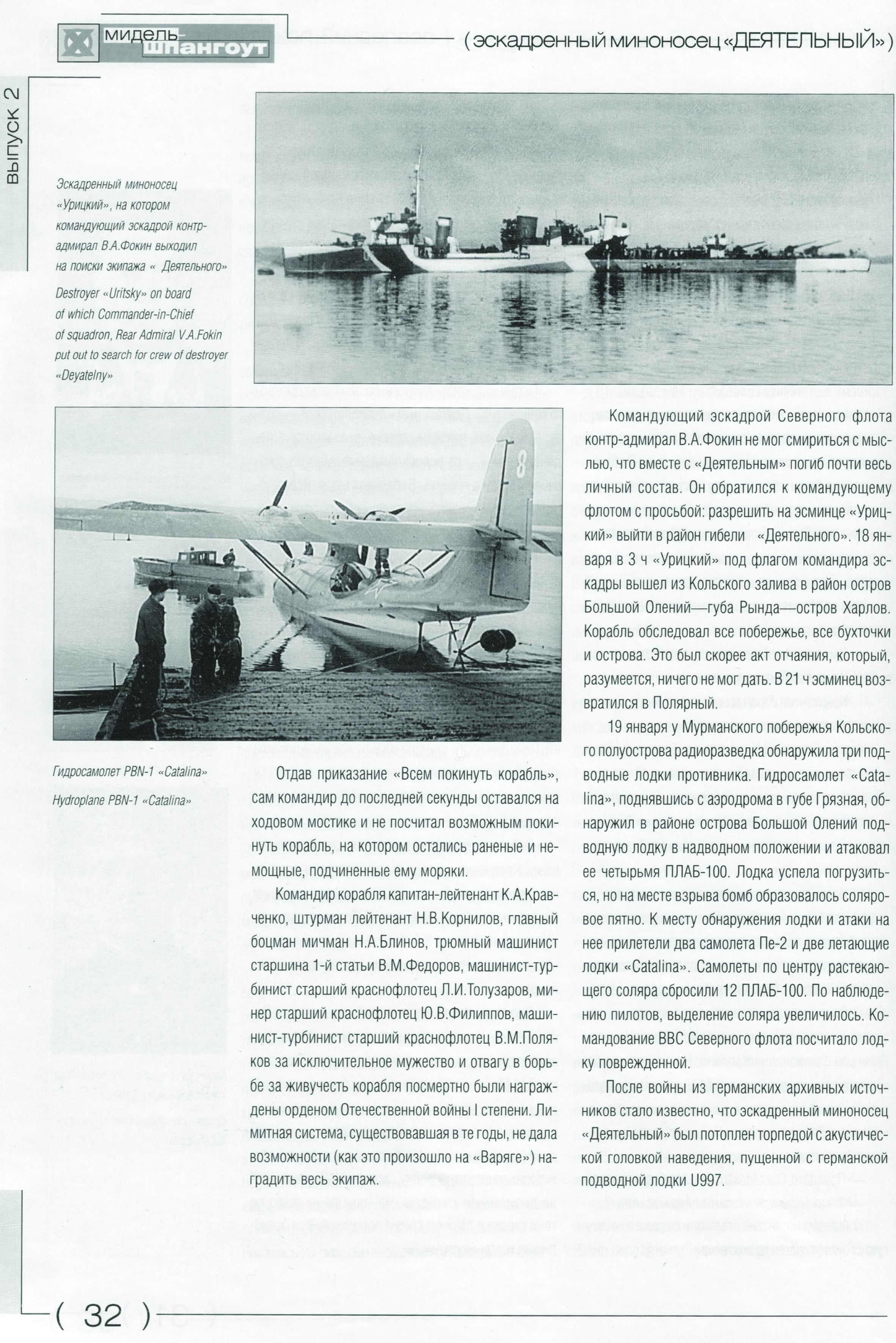 (Примечание. По данным сайта http://uboat.net эскадренный миноносец «Деятельный» был потоплен германской подводной лодкой U956.)