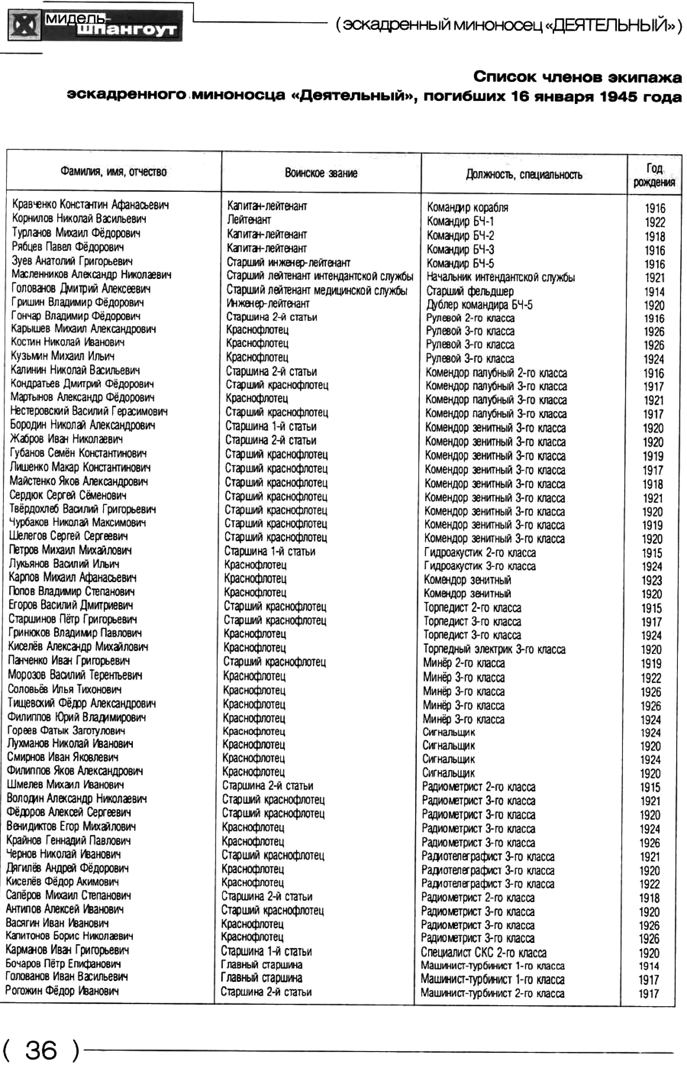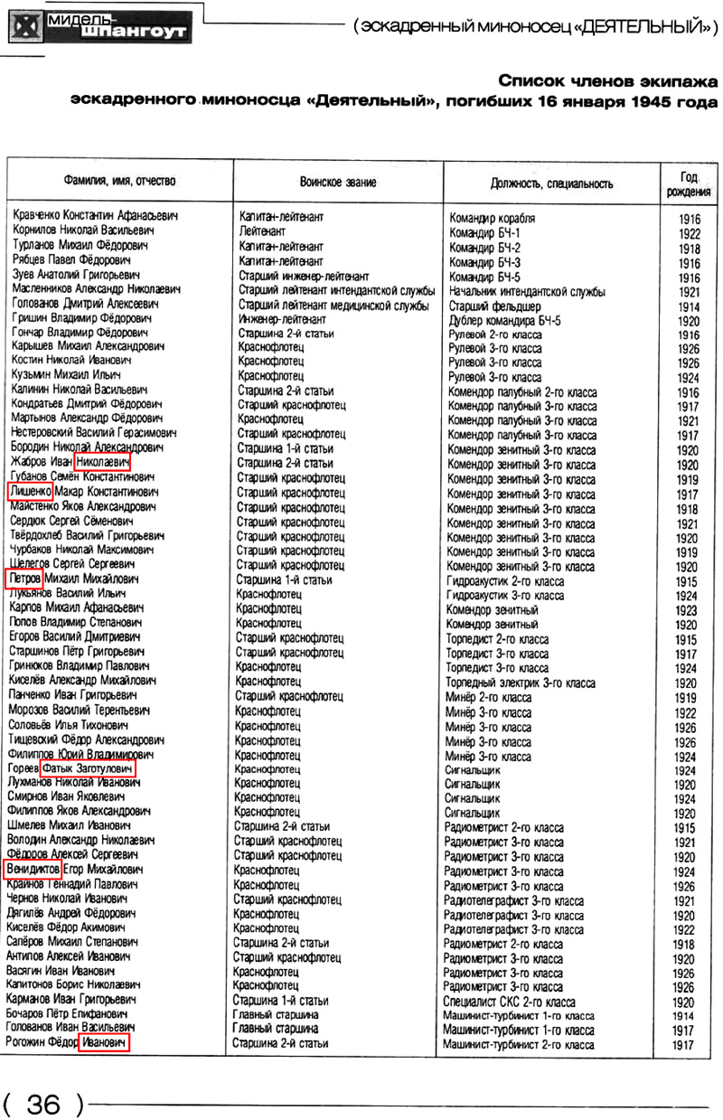 Список членов экипажа эскадренного миноносца «Деятельный», погибших 16 января 1945 года.