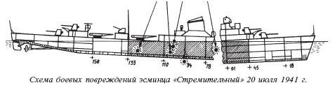 Неподвижный корабль получил сразу четыре прямых попадания. Одна 250-кг бомба, пробив фундамент торпедного аппарата № 1, взорвалась в машинном отделении на правом борту в районе 124-го шпангоута. Еще две такие же бомбы пробили верхнюю палубу и разорвались в котельном отделении № 3 в районе 100-го – 104-го шпангоутов. И наконец, одна 500-кг бомба, проломив палубу, рванула в котельном отделении № 1. Именно ее взрыв покончил с эсминцем. В 17.30 «Стремительный» разломился на две части, которые затем уже по отдельности скрылись под водой.