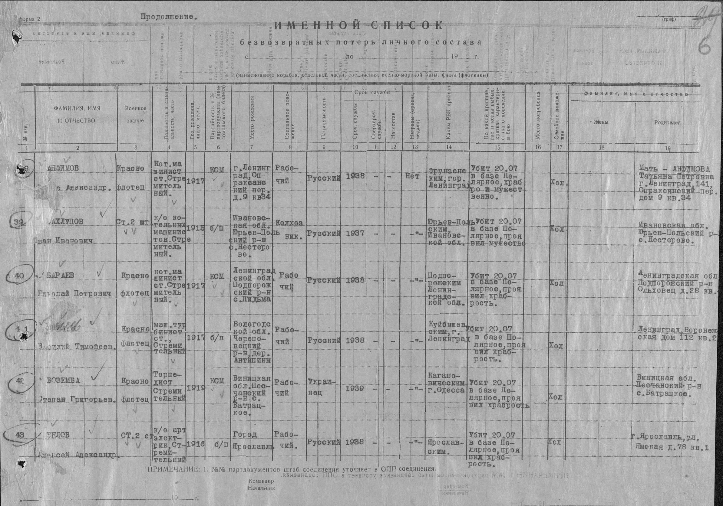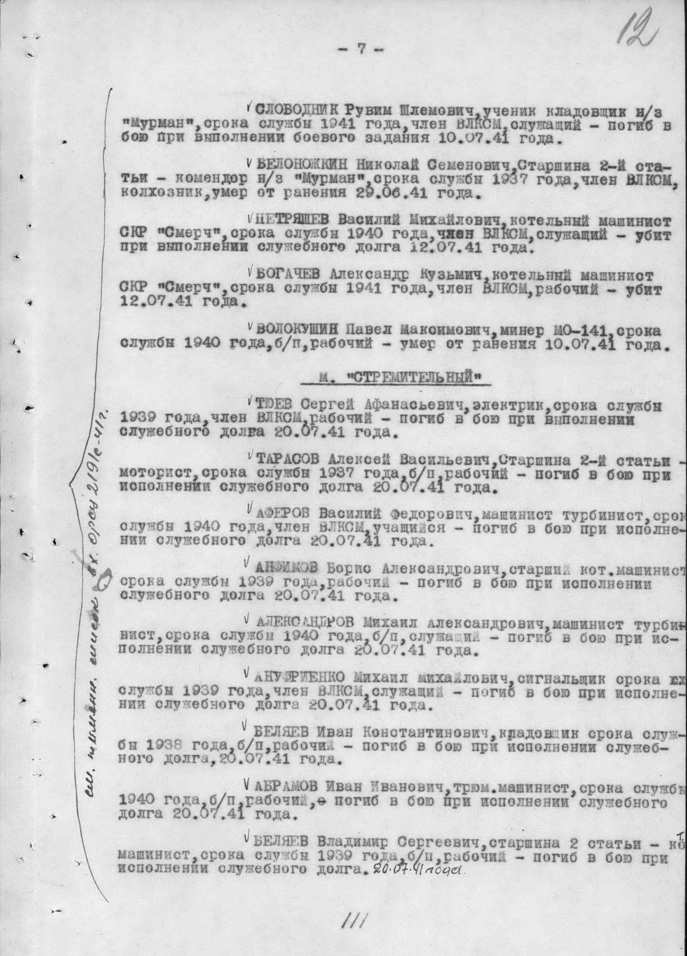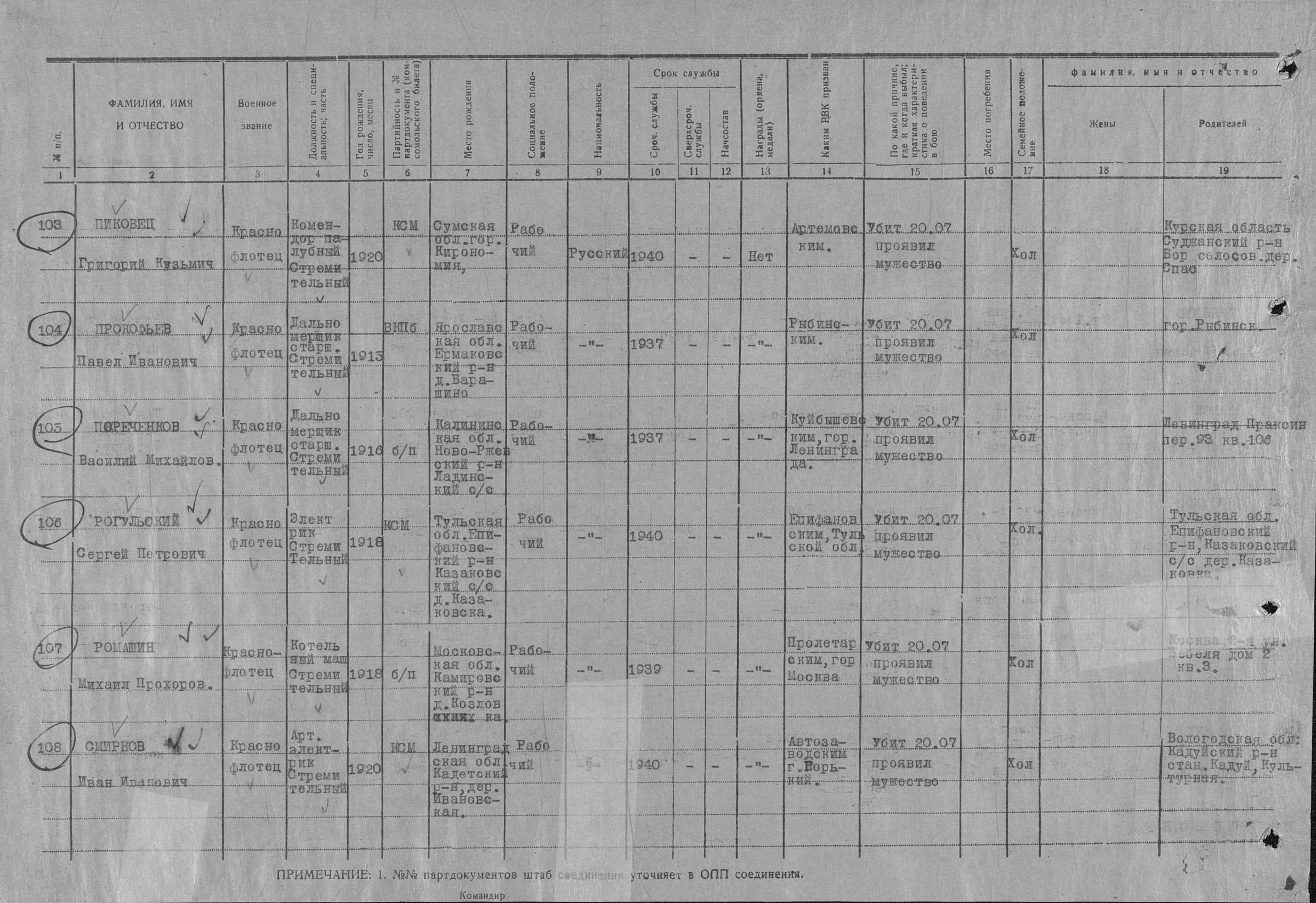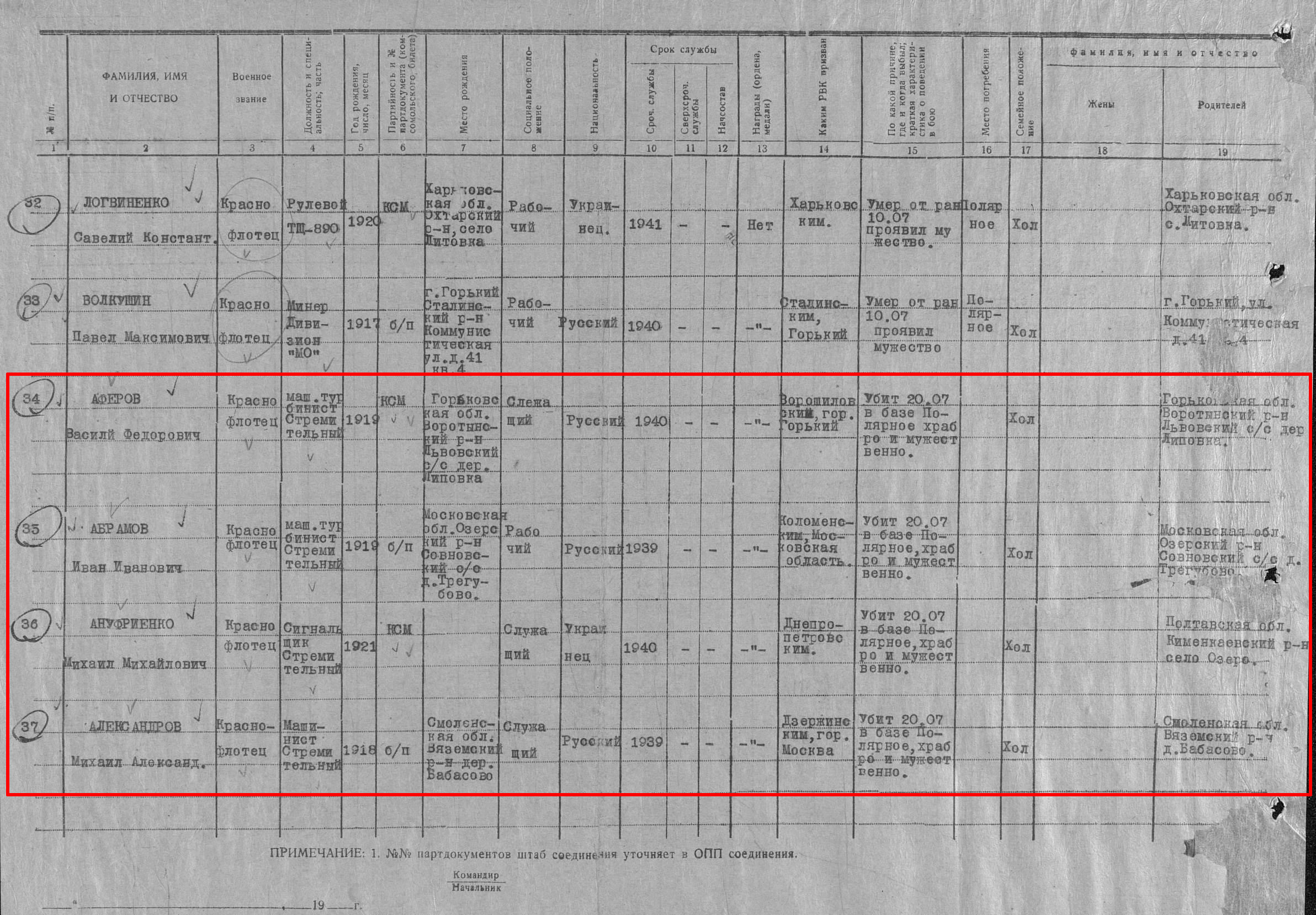 Список военнослужащих СФ погибших на ЭМ "Стремительный" 20 августа 1941 г. в Полярном: