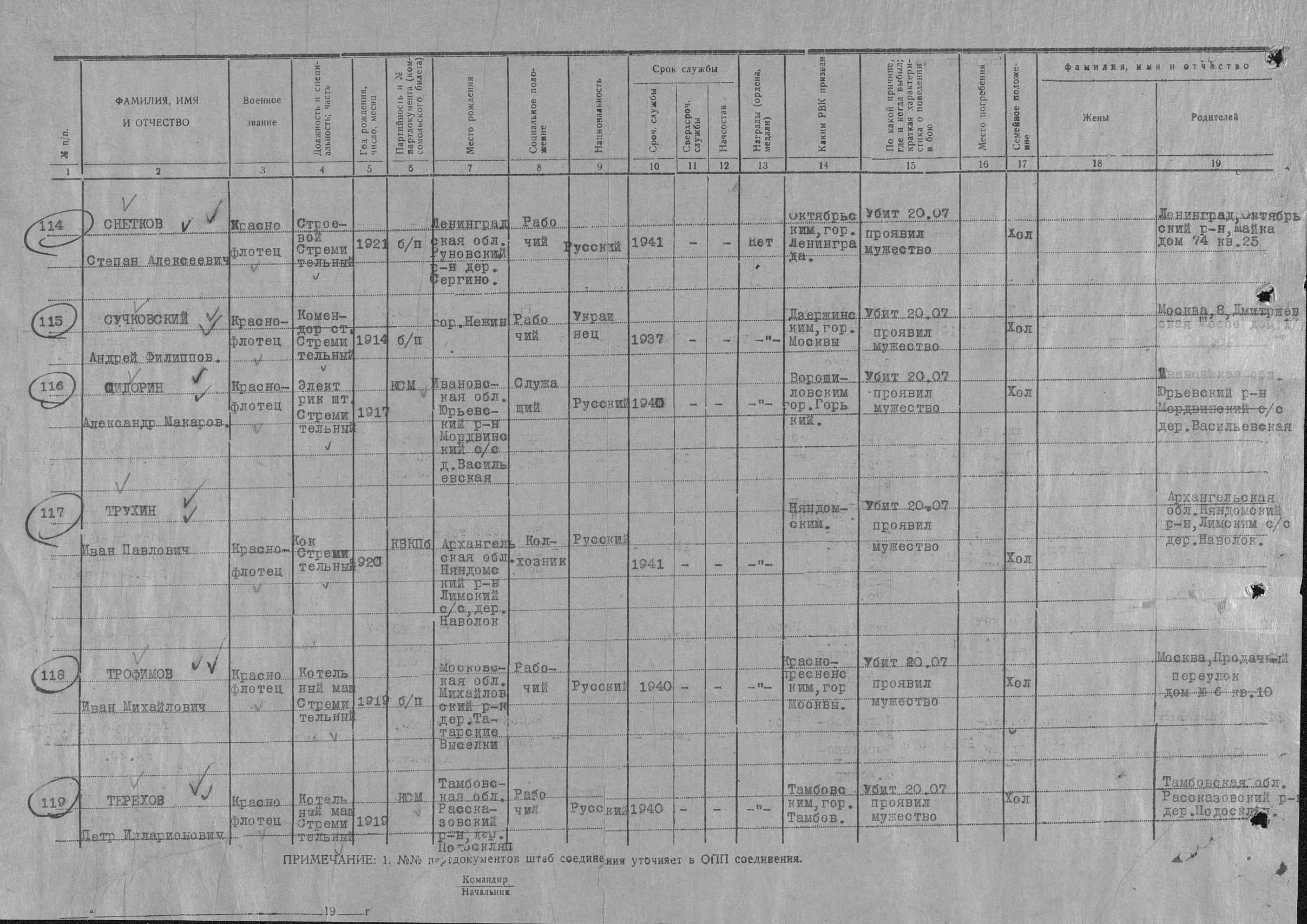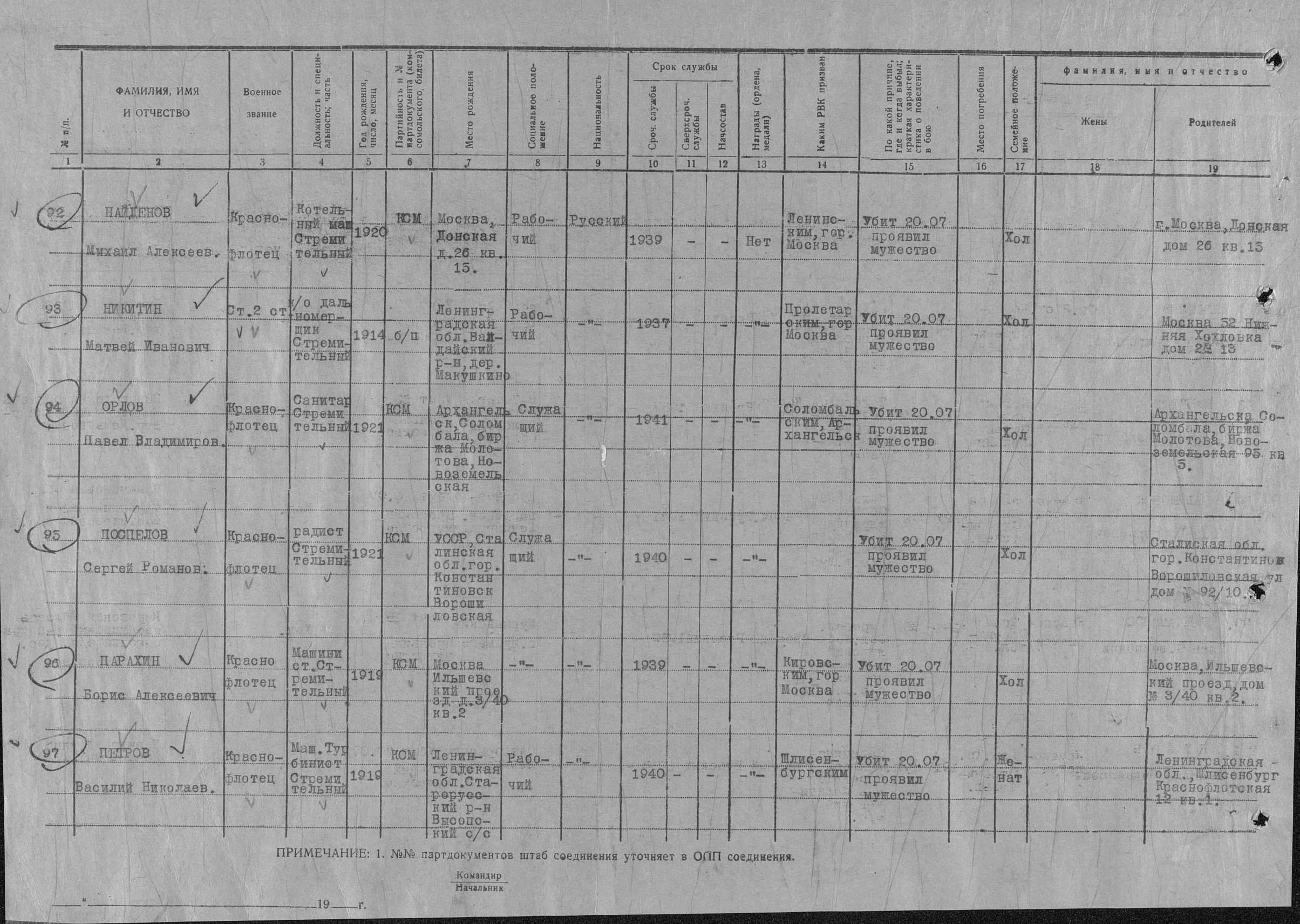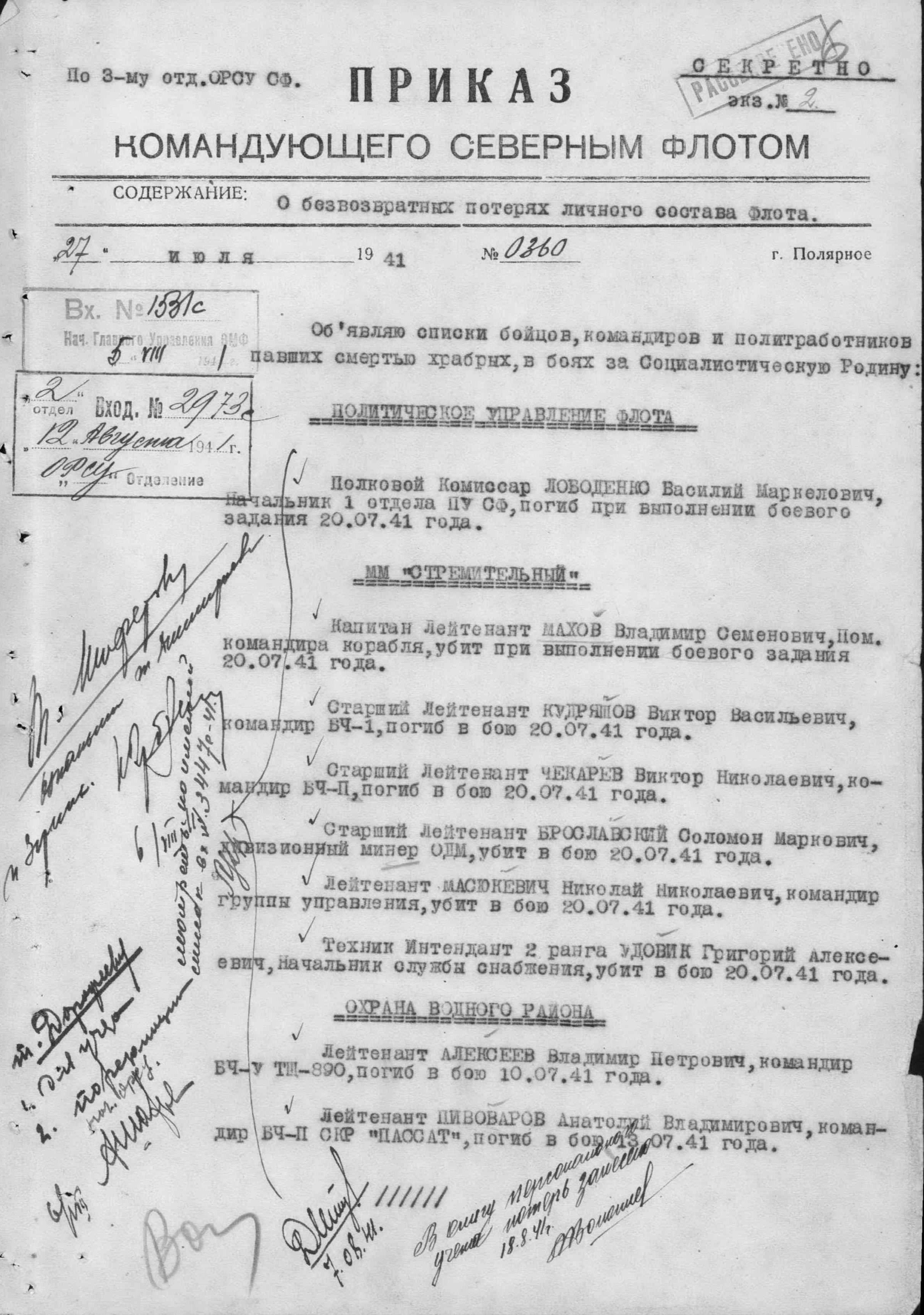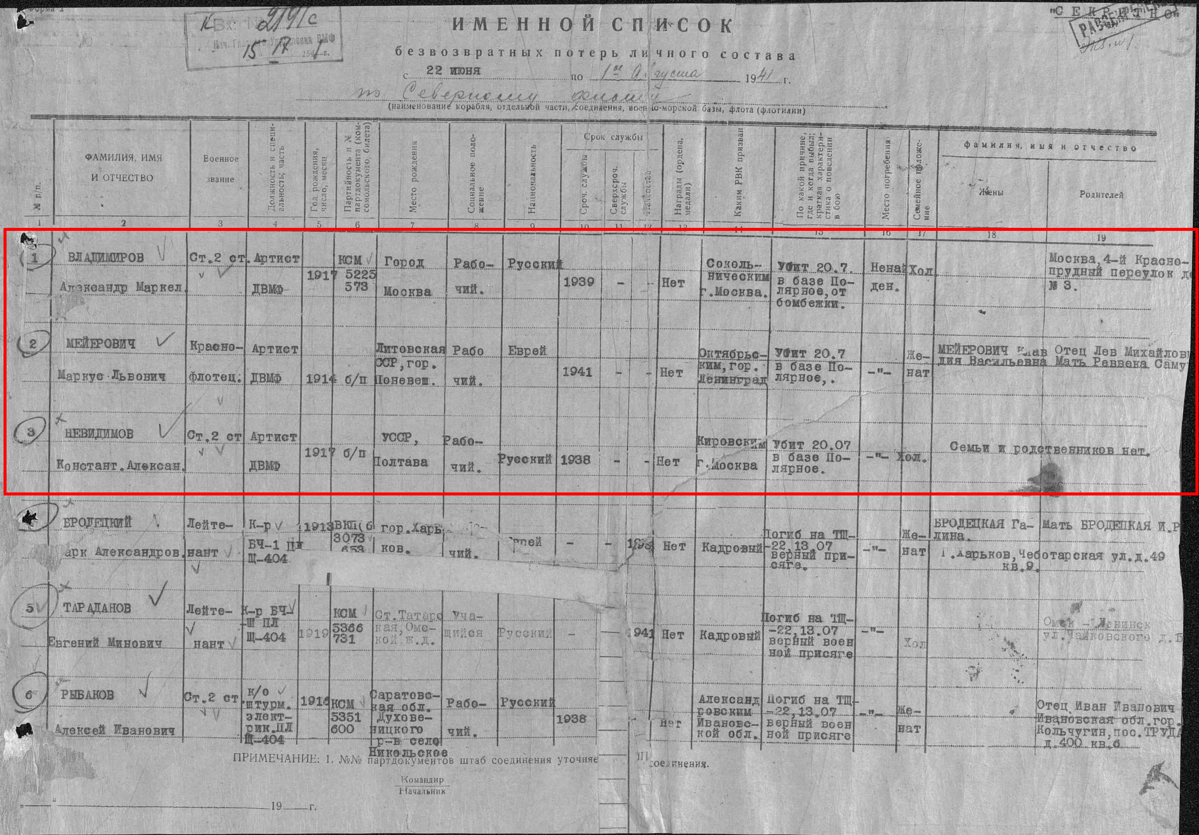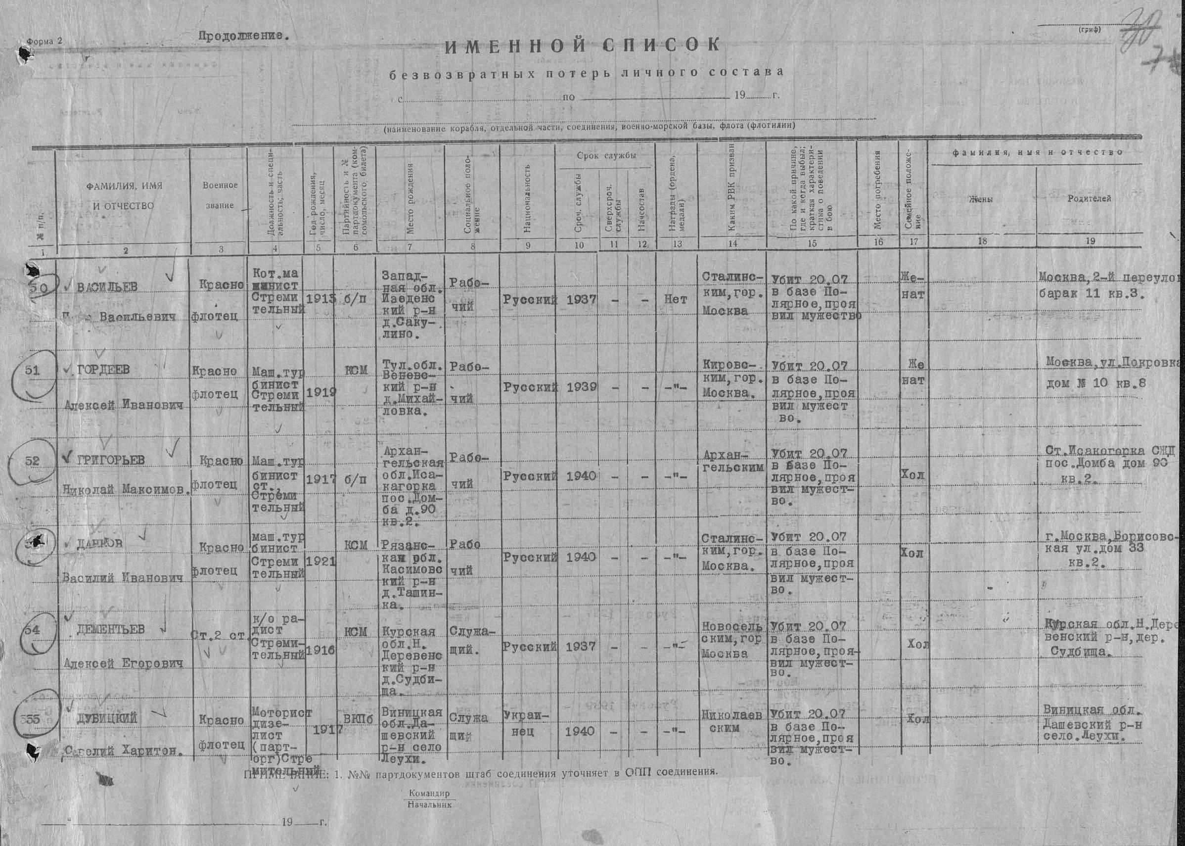 Список военнослужащих СФ погибших на ЭМ "Стремительный" 20 августа 1941 г. в Полярном: