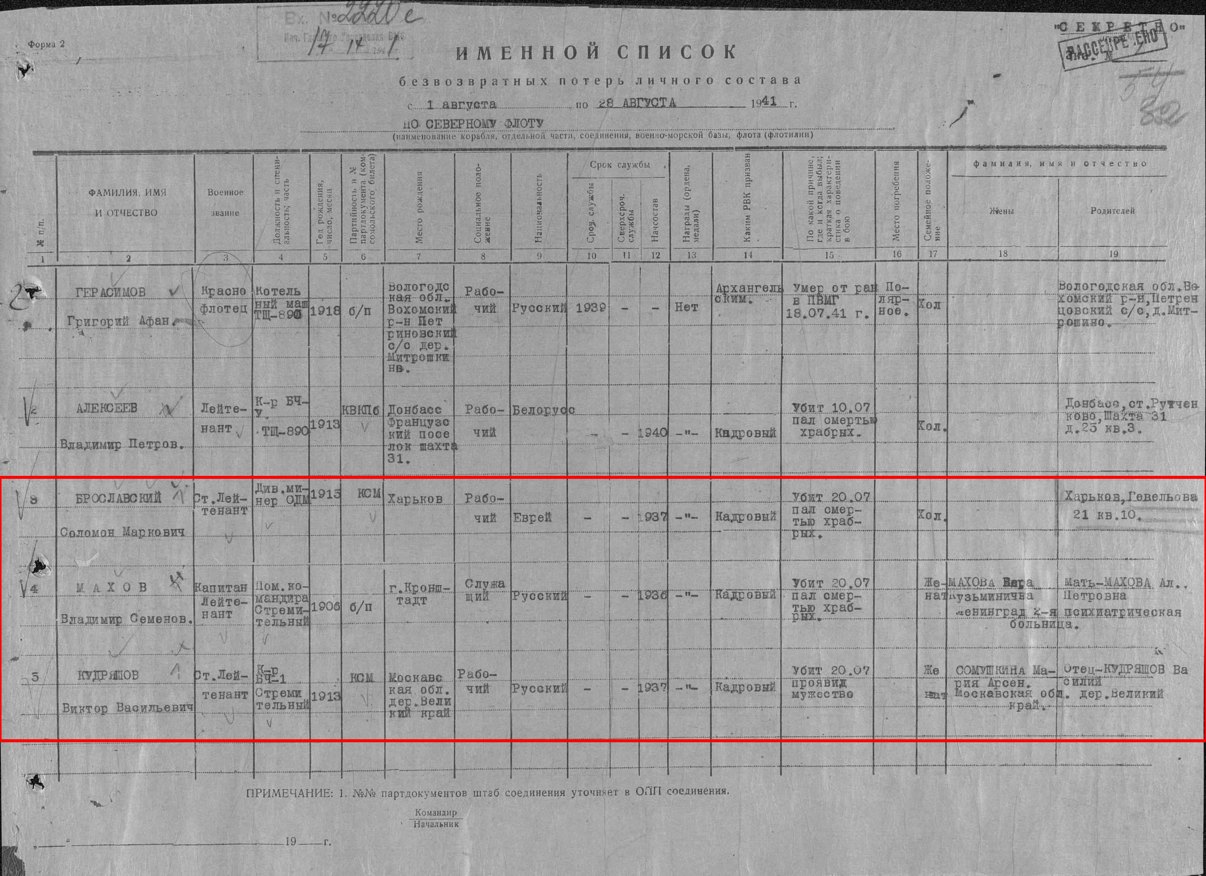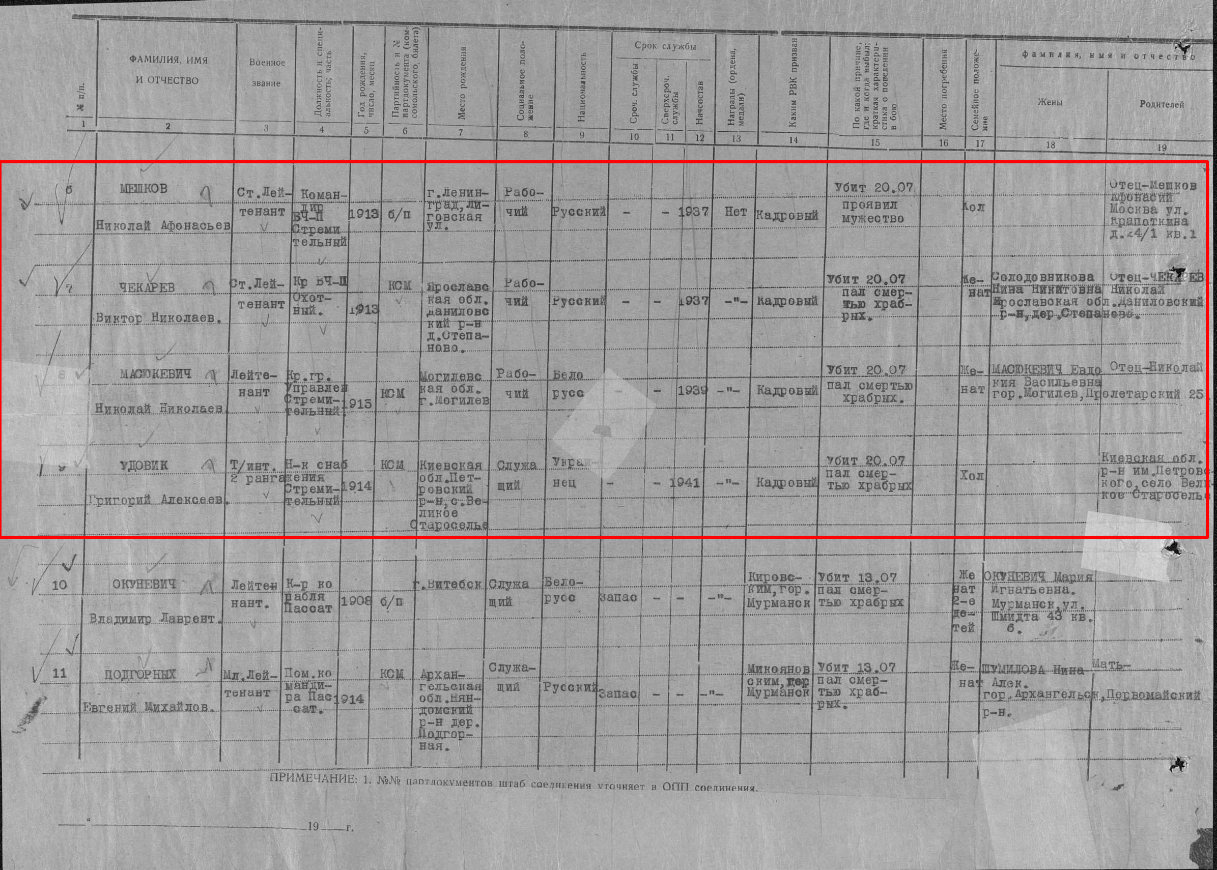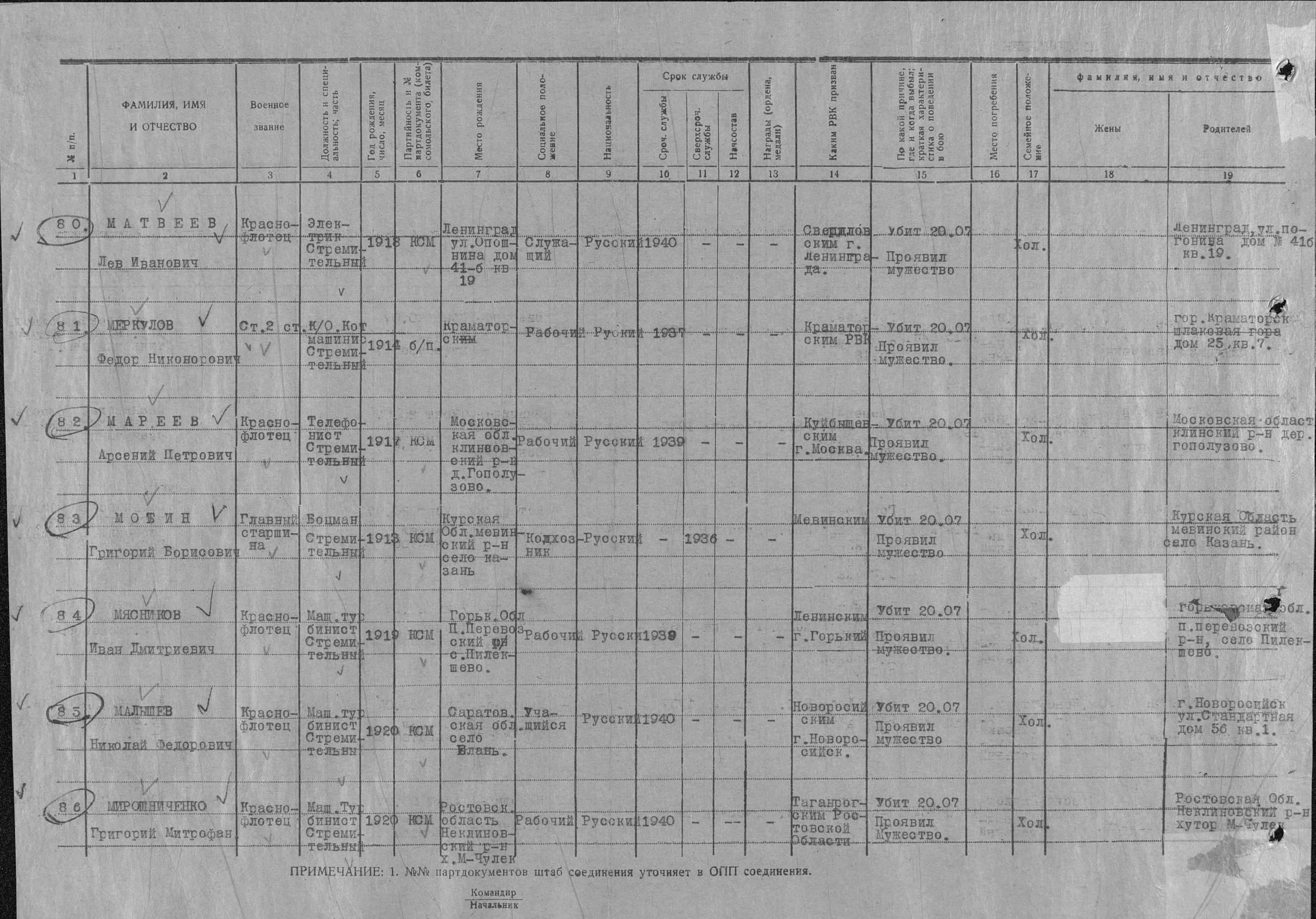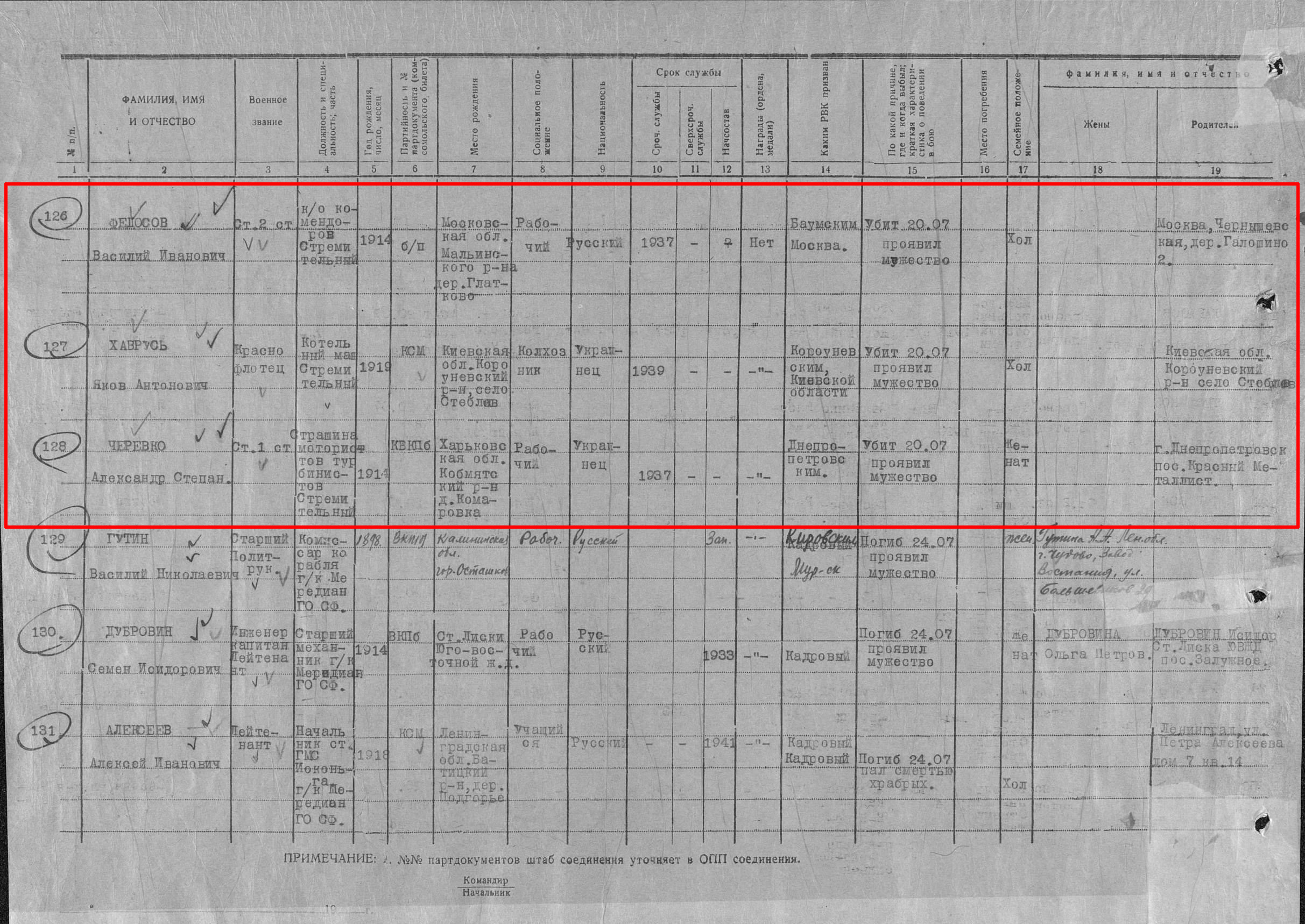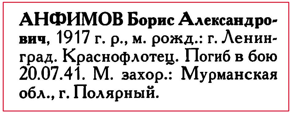 Список военнослужащих СФ погибших на ЭМ "Стремительный" 20 августа 1941 г. в Полярном: