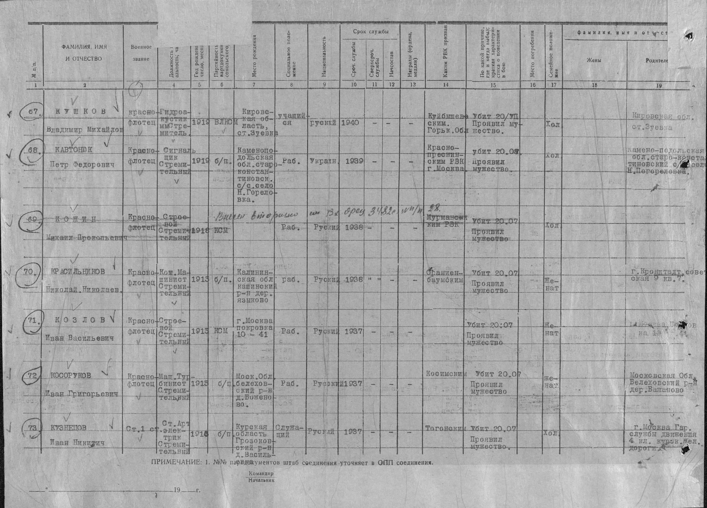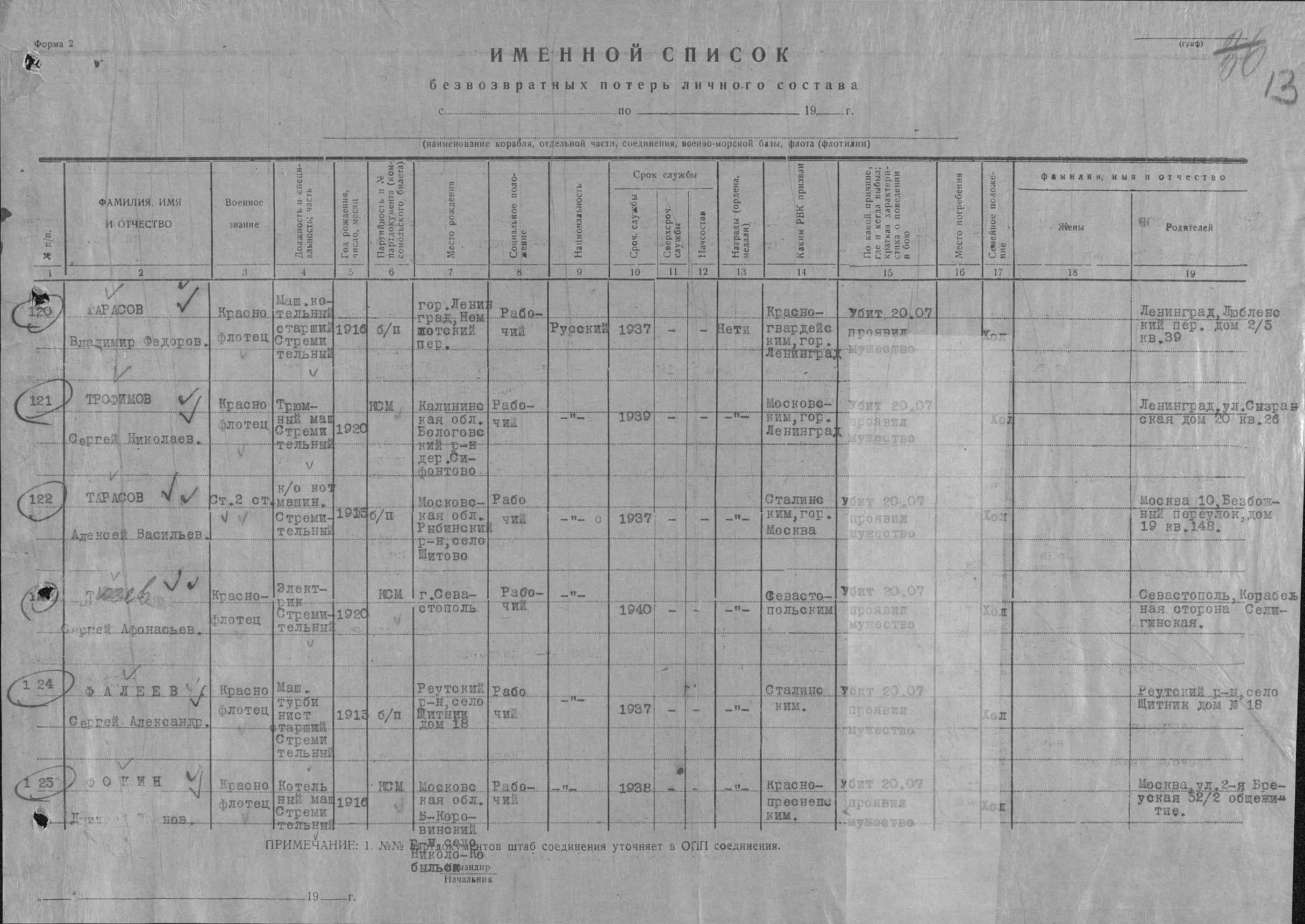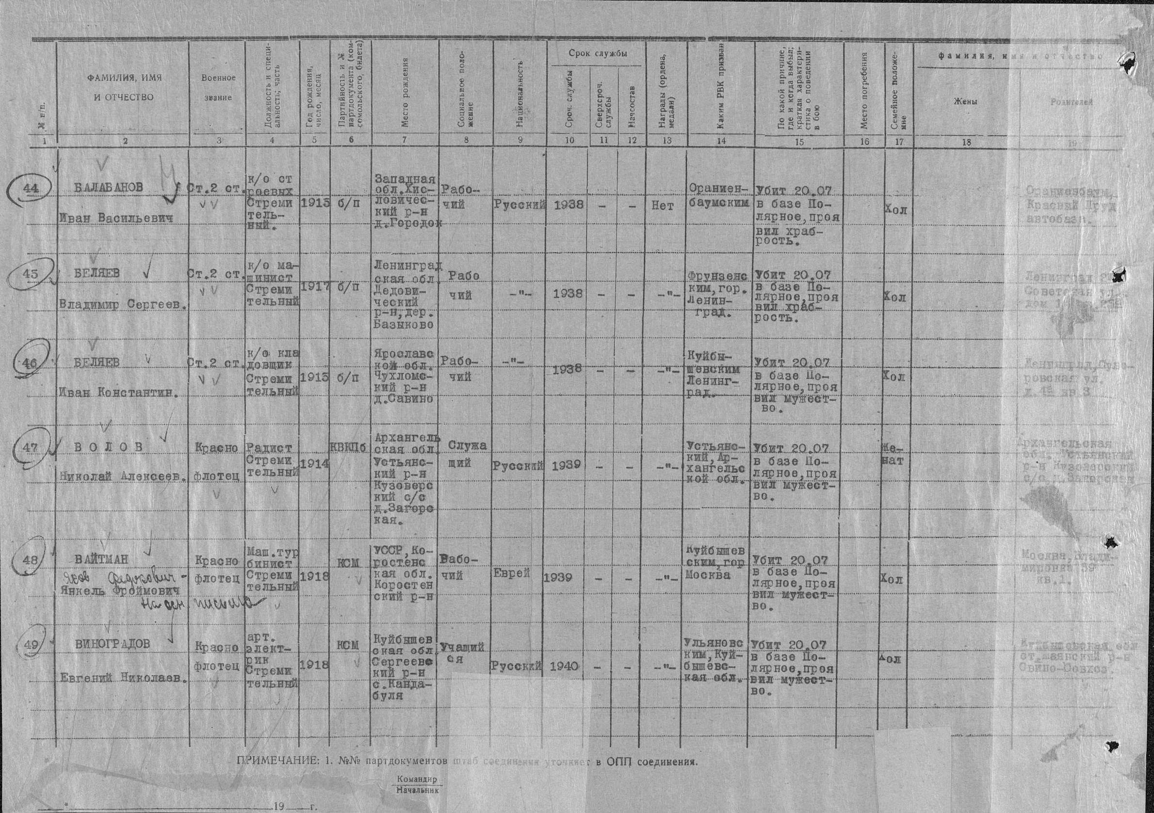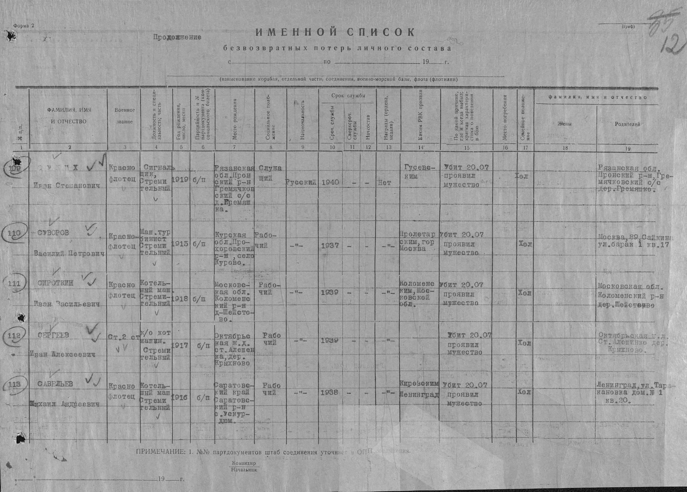 Список военнослужащих СФ погибших на ЭМ "Стремительный" 20 августа 1941 г. в Полярном: