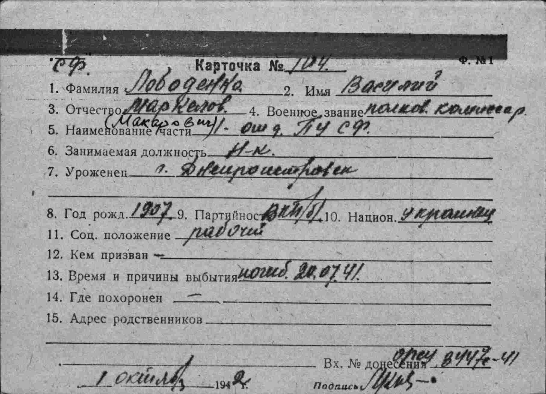 Лободенко Василий Маркелович(Макарович?), нач.1 отдела ПУ СФ