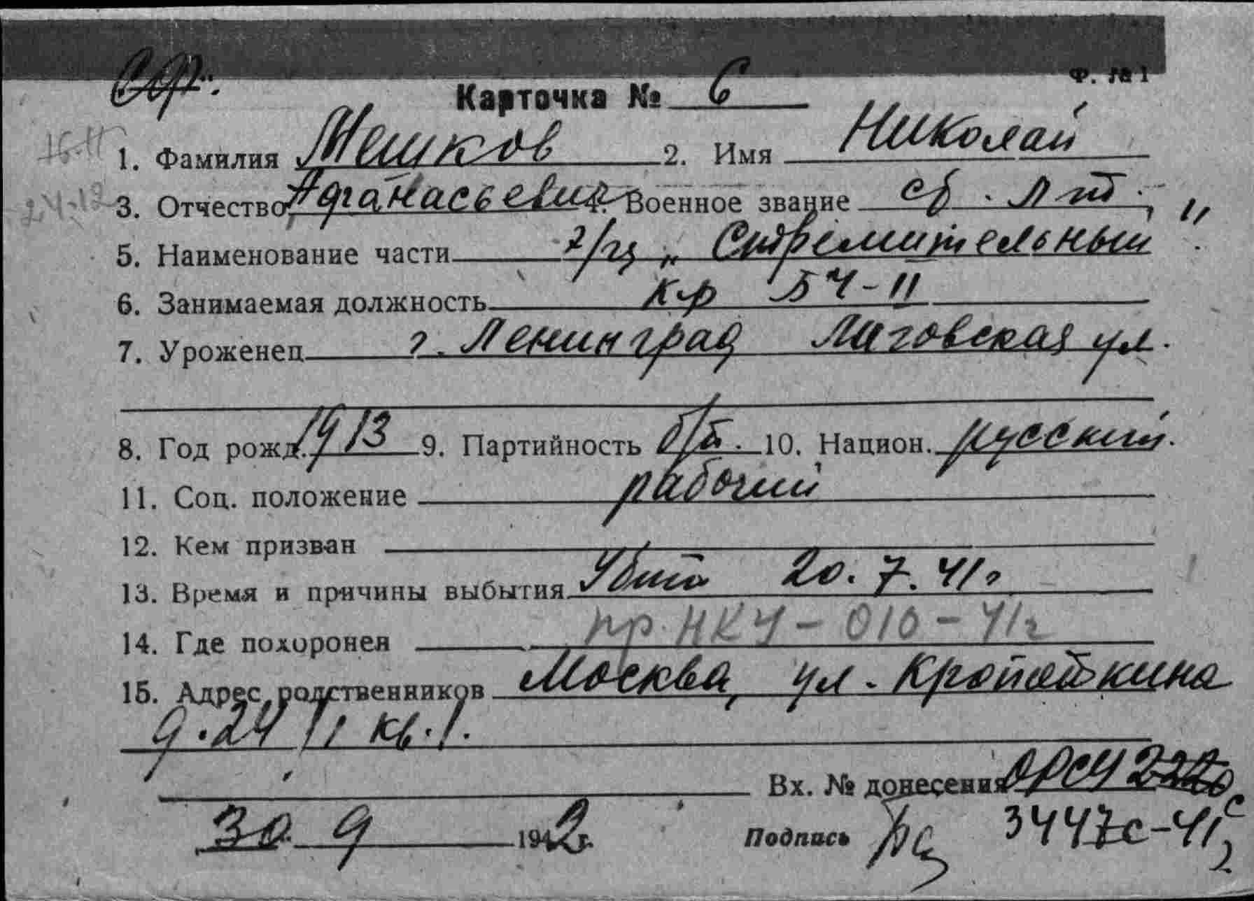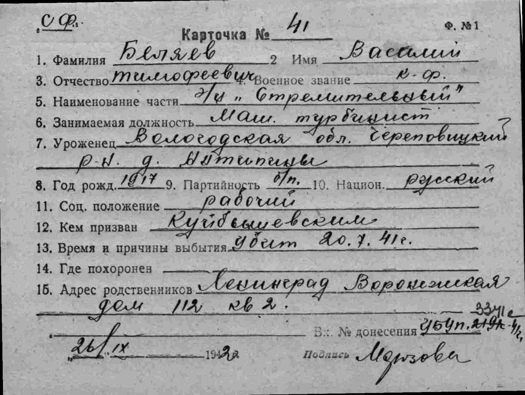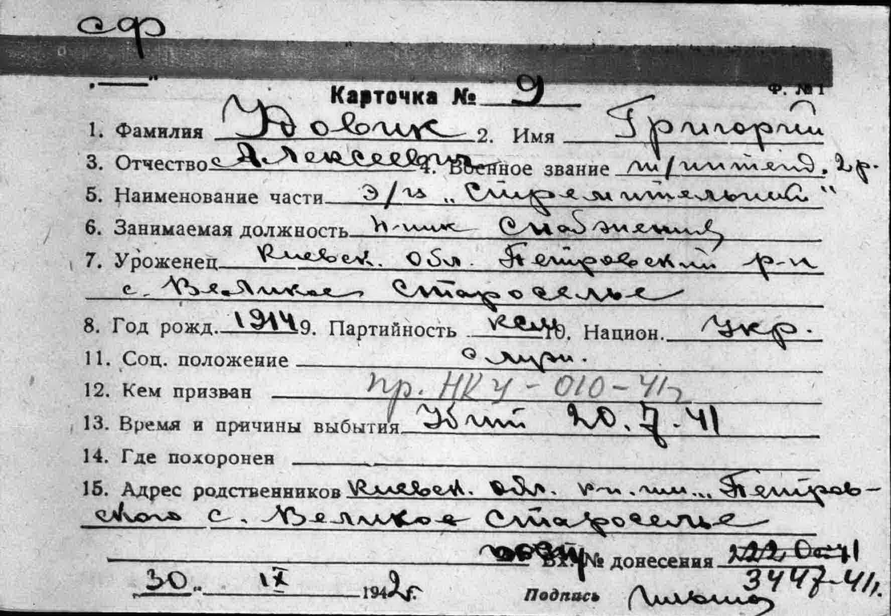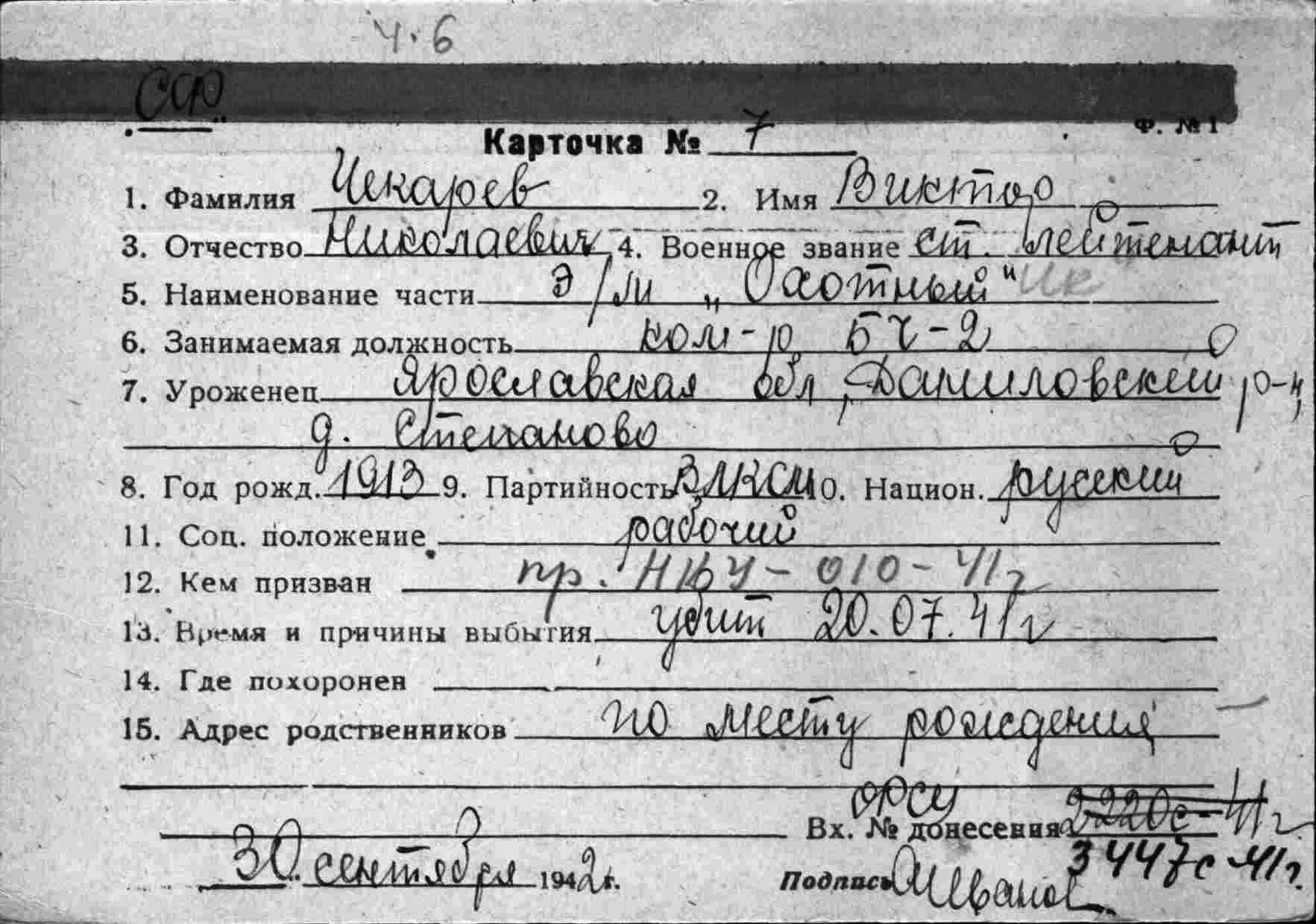 Дата выбытия 20.07.1941