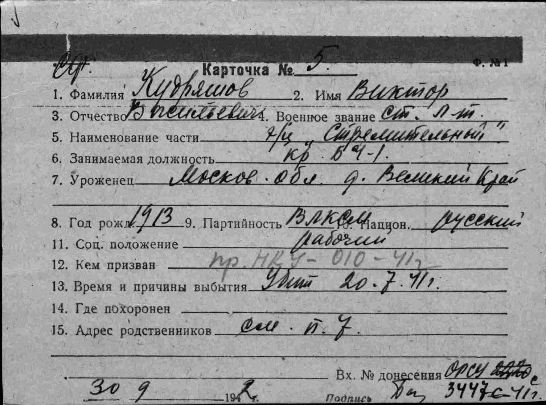 Место призыва Куйбышевский РВК, Московская обл., г. Москва, Куйбышевский р-н