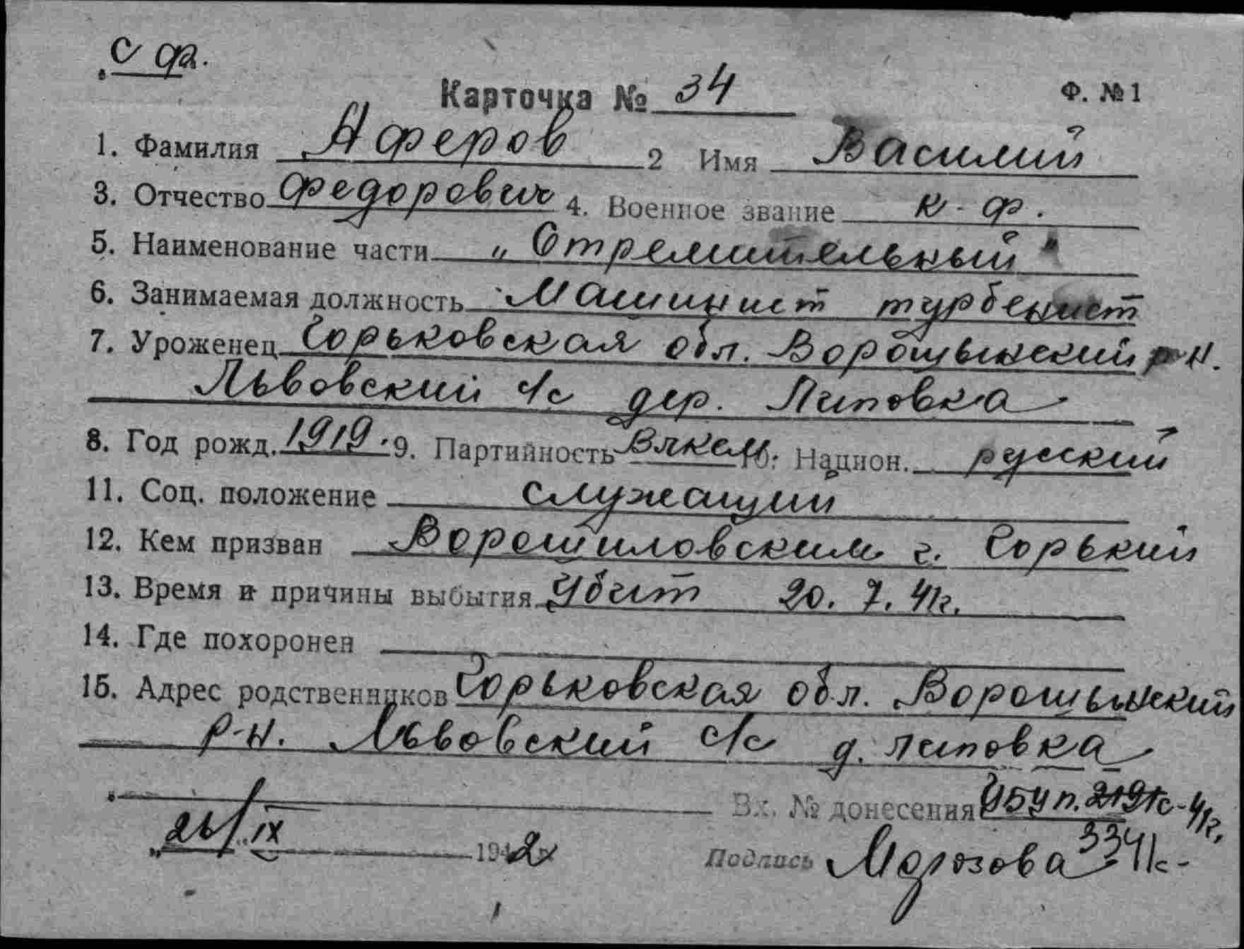Место призыва Автозаводский РВК, Горьковская обл., г. Горький, Автозаводский р-н