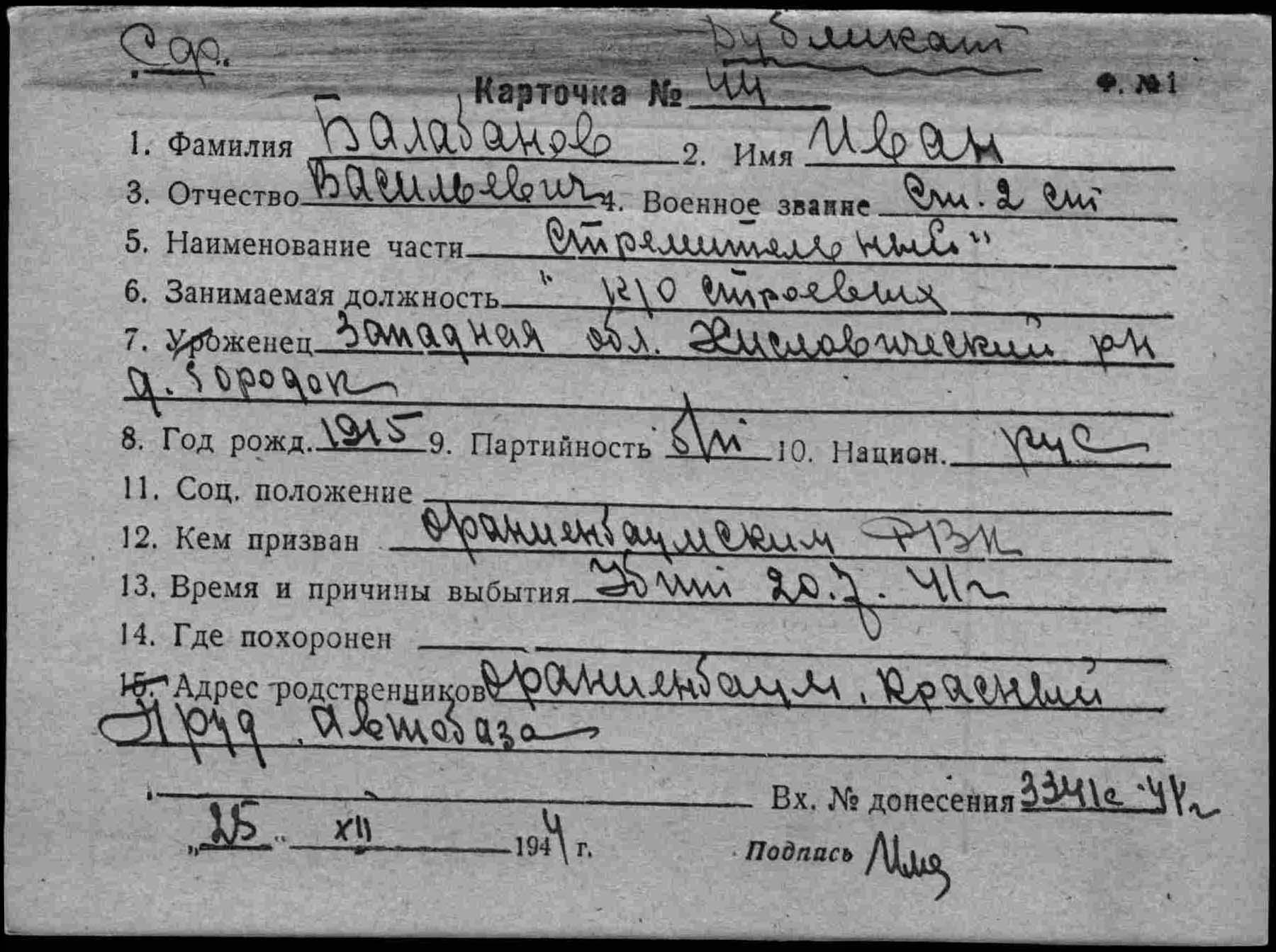 Название источника информации Картотека безвозвратных потерь