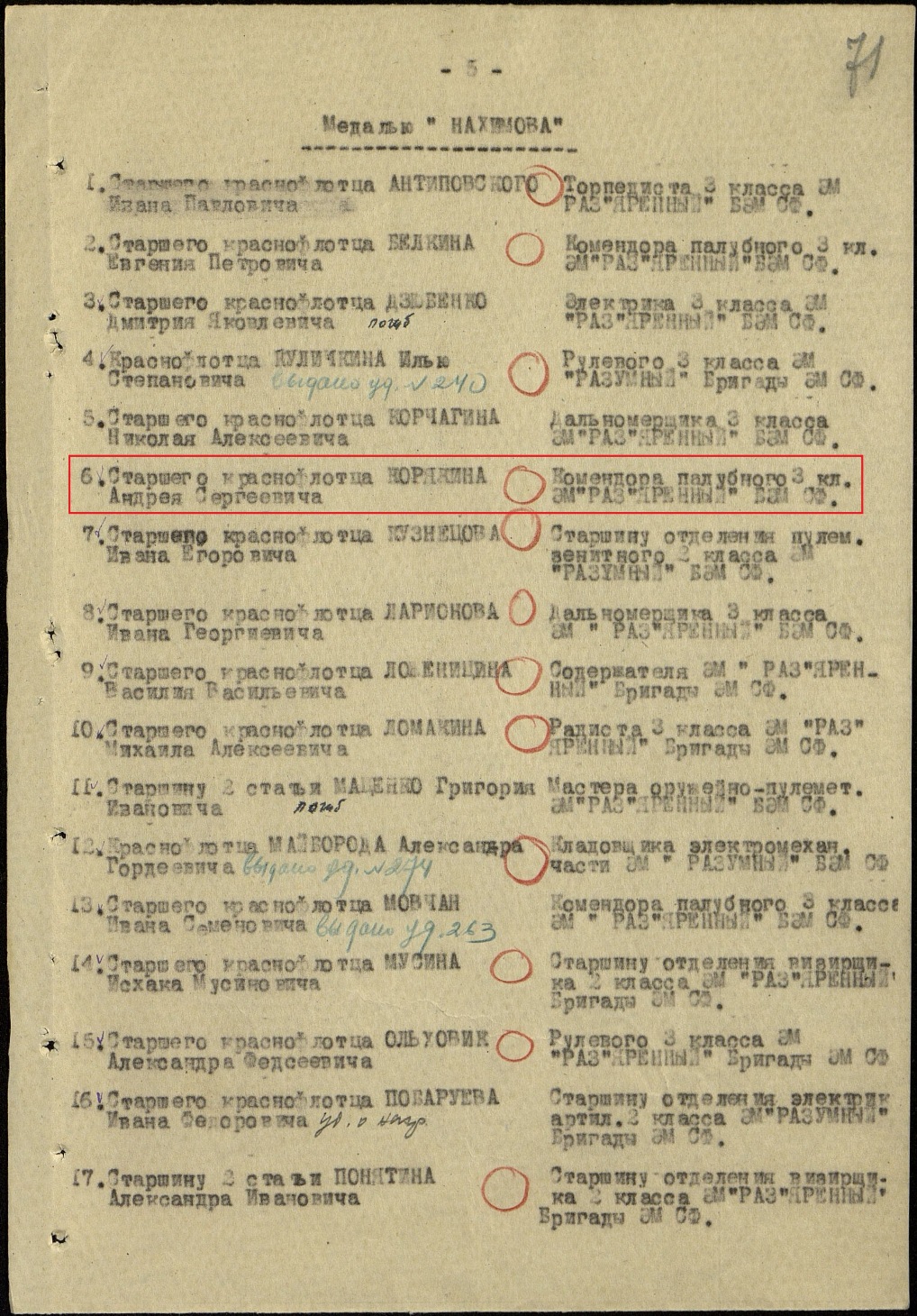 За проявленную храбрость и мужество в боях с немецко-фашистскими захватчиками, — ходатайствую о награждении старшего краснофлотца КОРЯКИНА медалью НАХИМОВА.