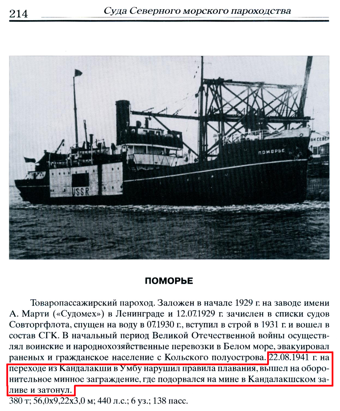 Эдлинский писал: "Было допущено немало ошибок и упущений, дорого обошедшихся государству. Результатом одной оплошности явилась гибель парохода "Поморье", который 22 августа 1941 года вышел из Кандалакши на Умбу. Капитаном порта был предписан судну твердый курс следования и указаны опасные минные зоны. Капитан "Поморья" отклонился от указанного курса и пошел напрямик. У мыса Титов с командного мостика парохода "Куйбышев" "Поморью" дали сигнал, что взятый им курс грозит опасностью. С "Поморья" не ответили на сигнал. Вскоре судно вошло в минное поле, подорвалось на двух минах и затонуло у острова Седловатый на расстоянии двух миль от берега. Из 30 членов команды (членов команды было 34. - А. С.) и 30 пассажиров спаслись два человека: матросы Клугман и Чураков. Погиб и капитан судна, грубо нарушивший дисциплину.*