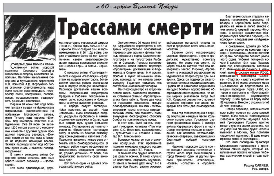 Назовем погибших моряков поименно: капитан П. Г. Ижмяков, старпом С. С. Воронцов, 2-й помощник В. В. Цинцадзе, 3-й помощник А. И. Никулин, старший механик Н. И. Кукаренко, машинисты 1 и 2 классов Л. А. Телятьев, В. Н. Семенов, матросы 1 класса В. С. Попов, В. В. Брехов, Б. Н. Наборский, кочегары Г. Д. Захаров, М. Н. Шадрин, Э. М. Лебедев, А. П. Некрасов, повар А. Г. Арсетская, буфетчица О. Я. Ваганова, дневальная Е. И. Казанская, камбузница Г. Н. Большакова, юнги Н. Н. Тюричев и В. В. Юдин. Отрадно, что эти имена появились на страницах Книги памяти, изданной в Мурманске.