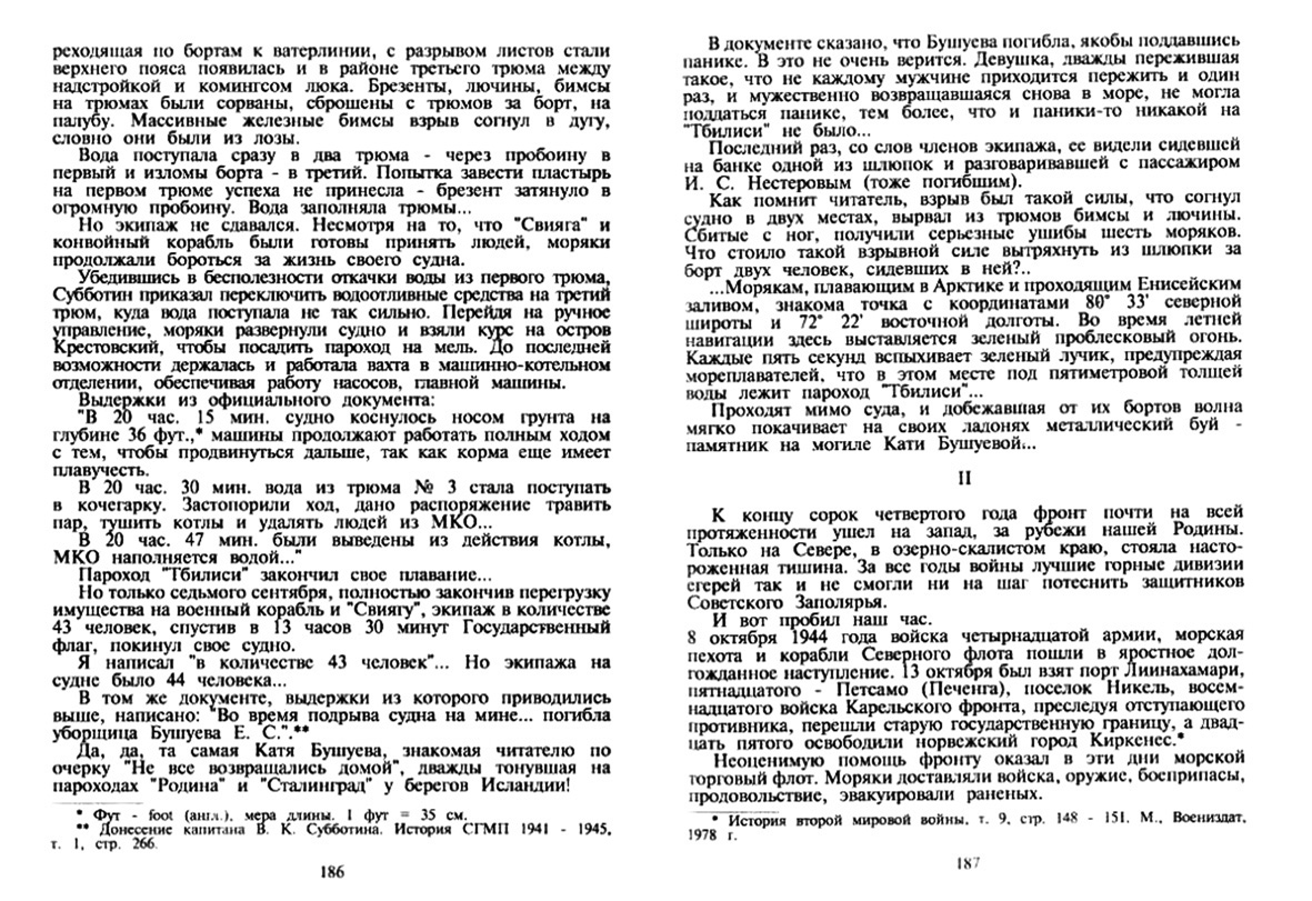 В документе сказано, что Бушуева погибла, якобы поддавшись панике. В это не очень верится. Девушка, дважды пережившая такое, что не каждому мужчине приходится пережить и один раз, и мужественно возвращавшаяся снова в морс, не могла поддаться панике, тем более, что и паники-то никакой на "Тбилиси" не было...