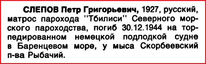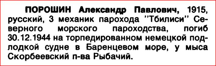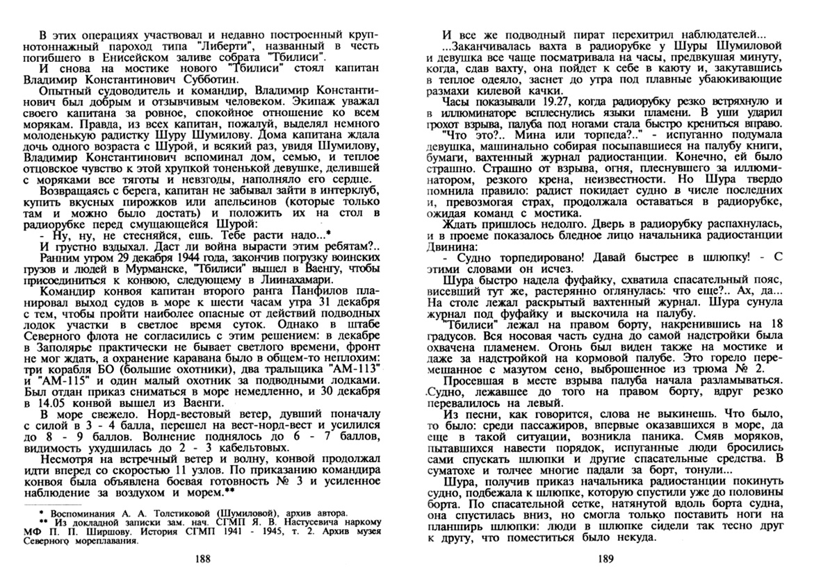 Заплакала Шура только на следующий день, в Полярном, сдавая командиру конвоя помятый, с мокрыми страницами, вахтенный журнал радиостанции парохода "Тбилиси"...*