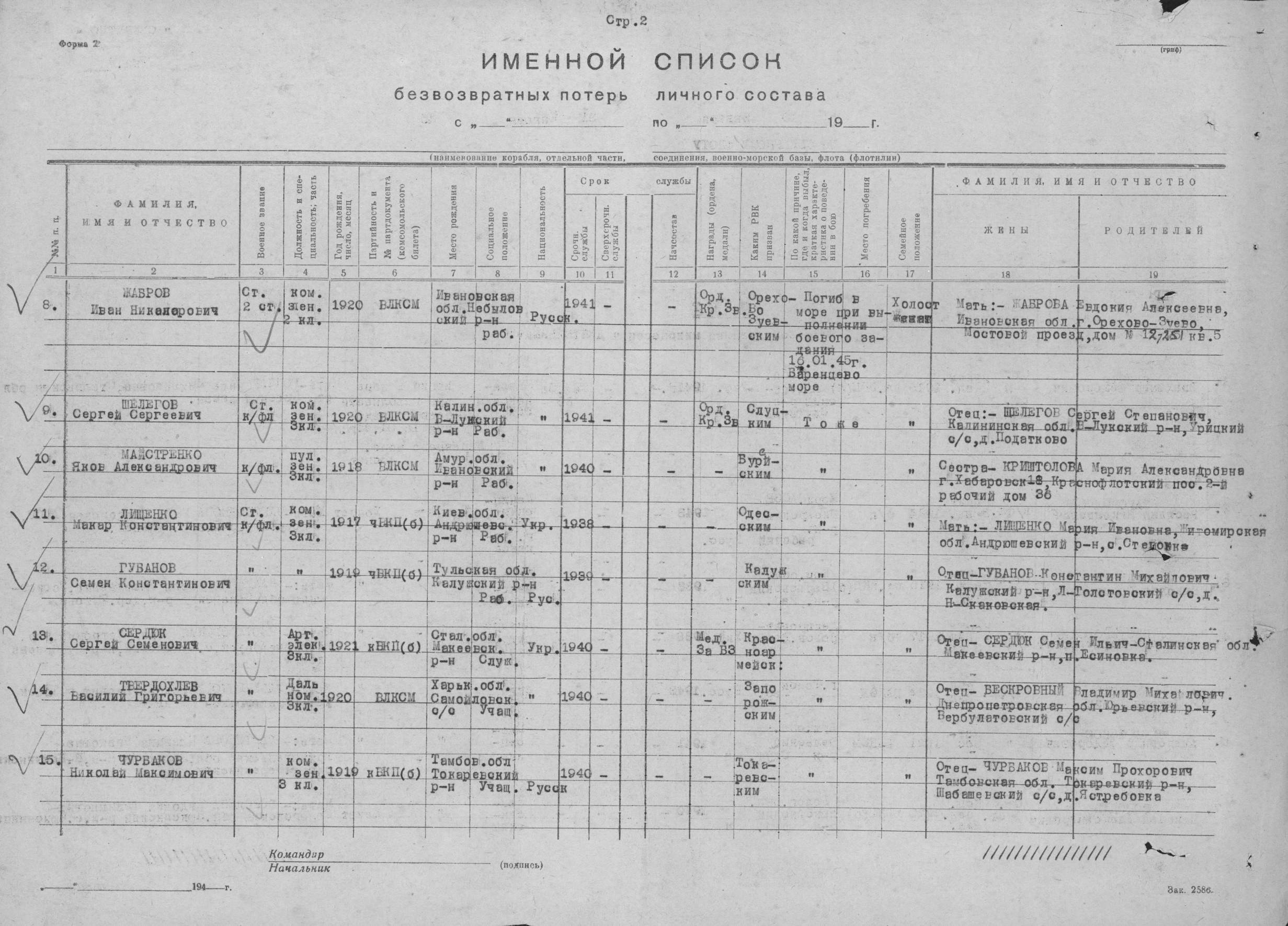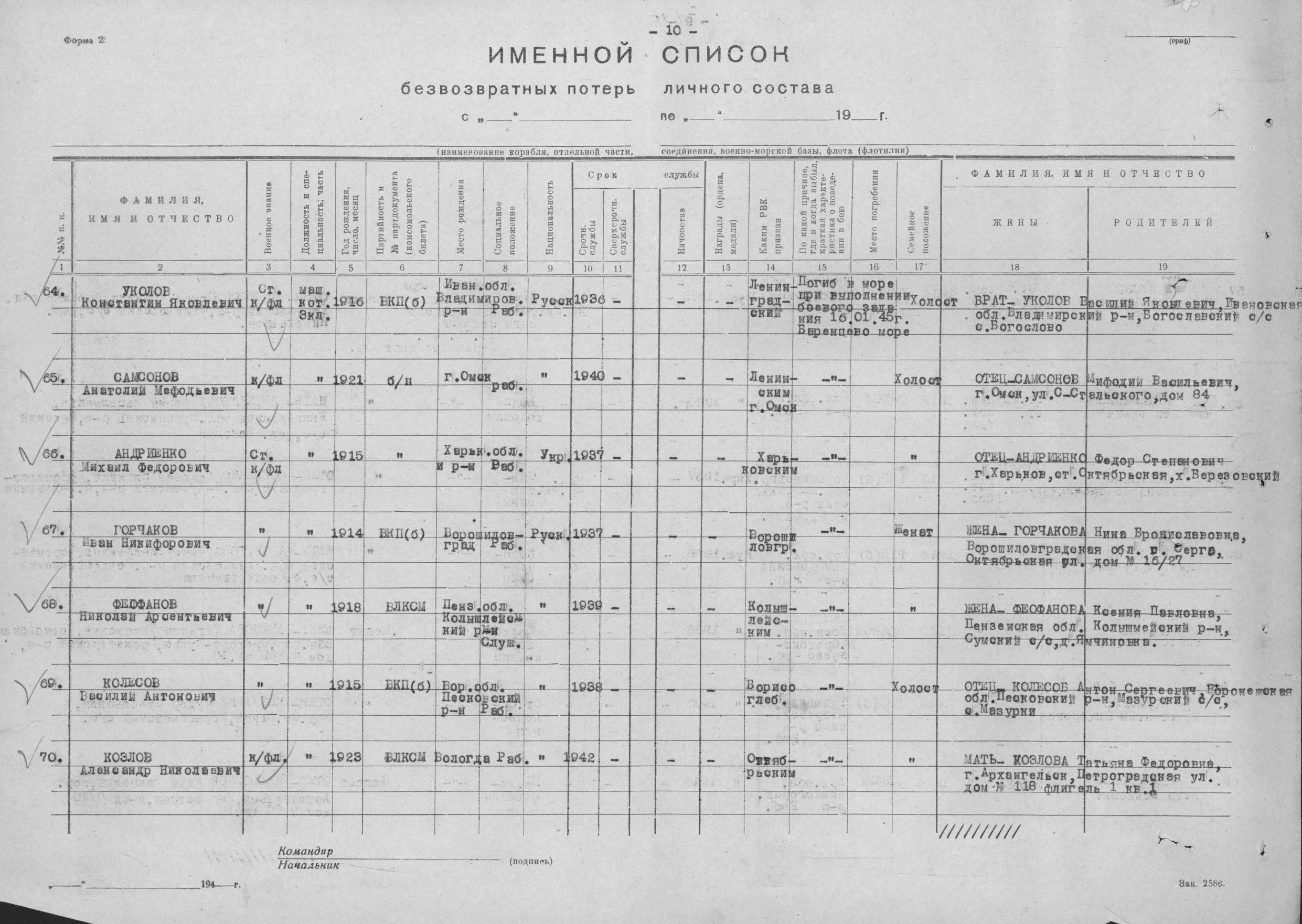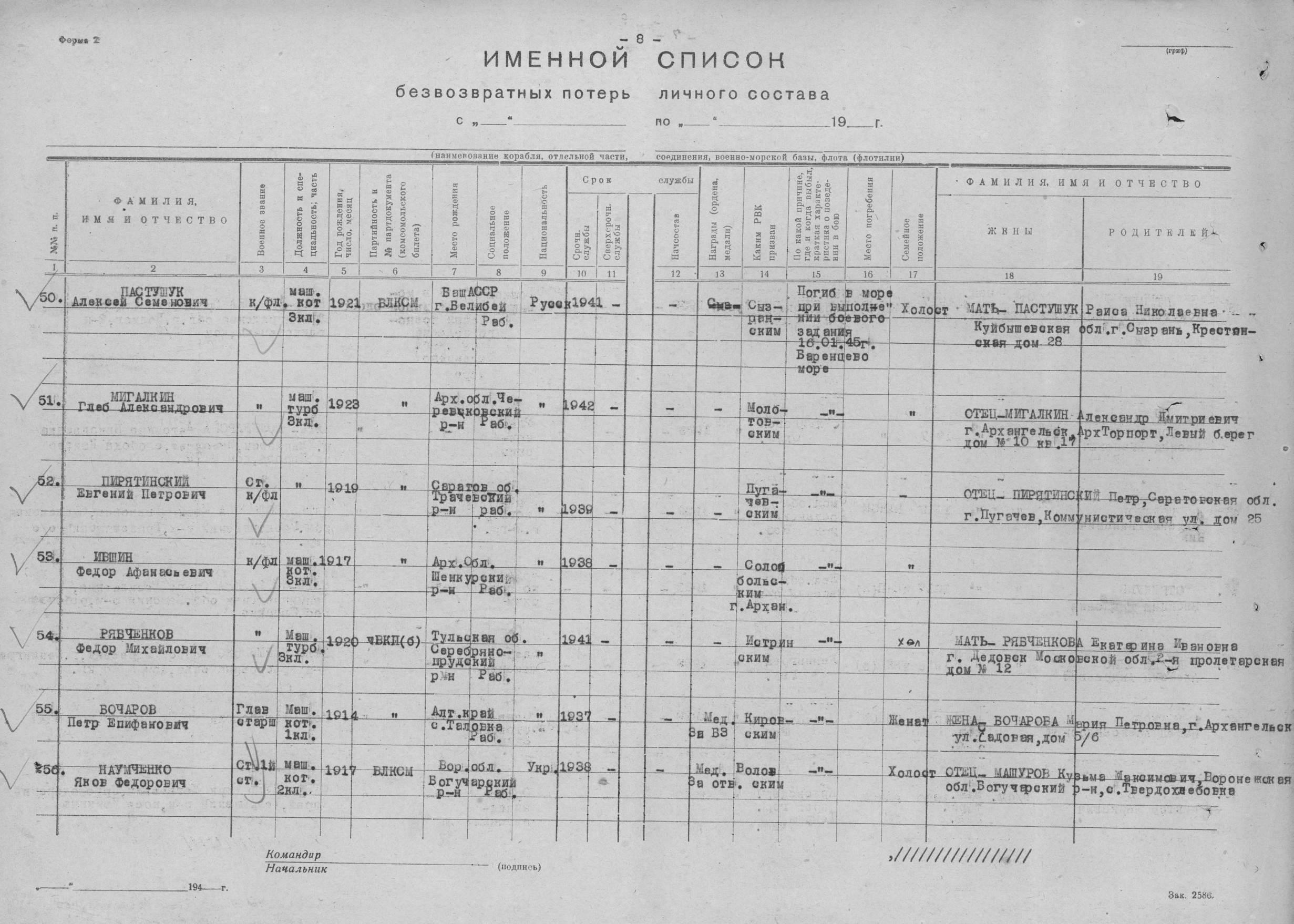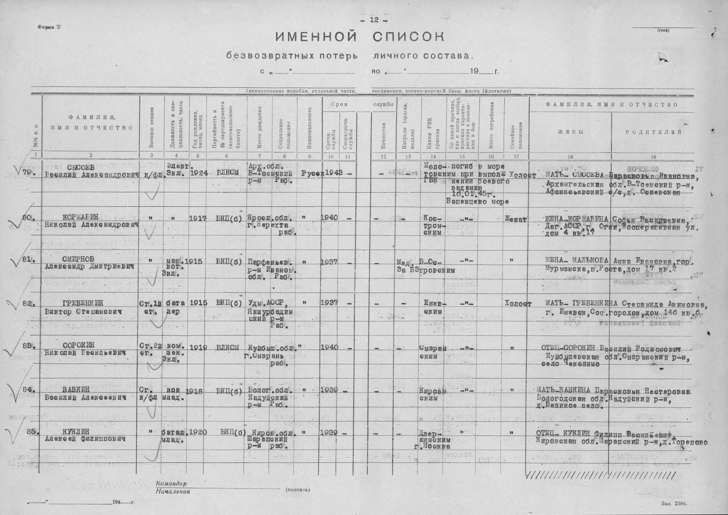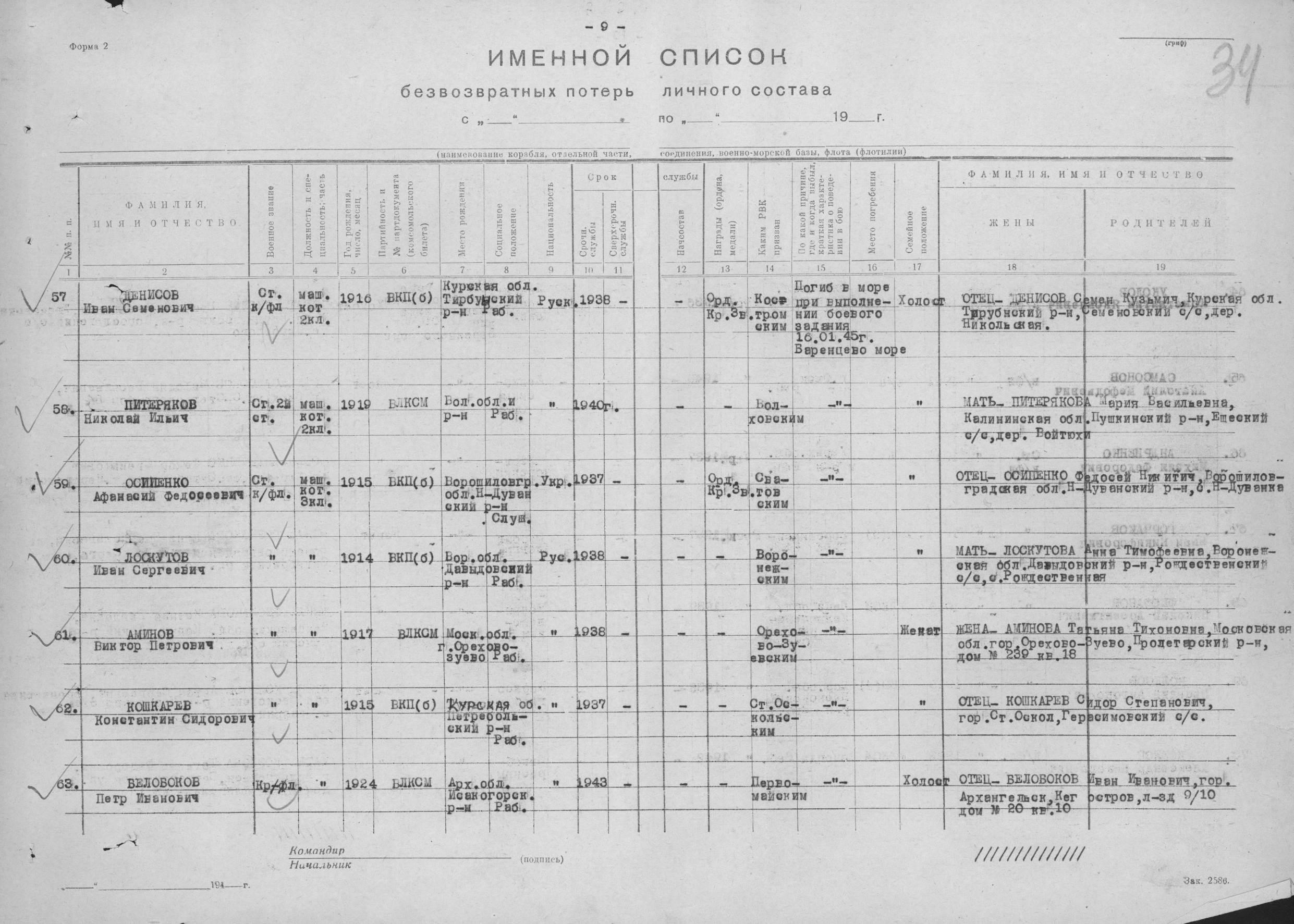 Список экипажа ЭМ "Деятельный" погибших 16 января 1945 года в районе о. Большой Олений при торпедировании германской ПЛ U956.