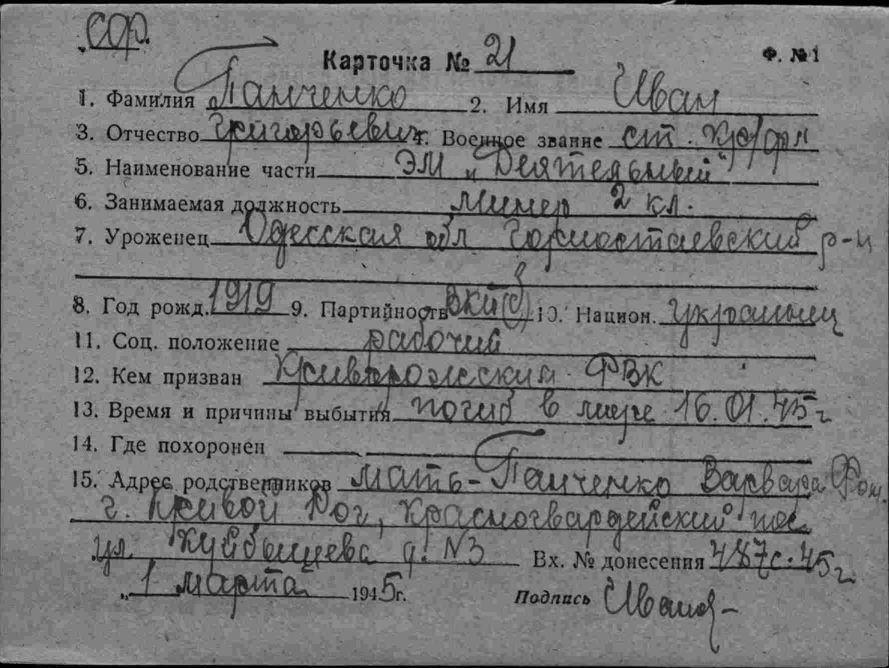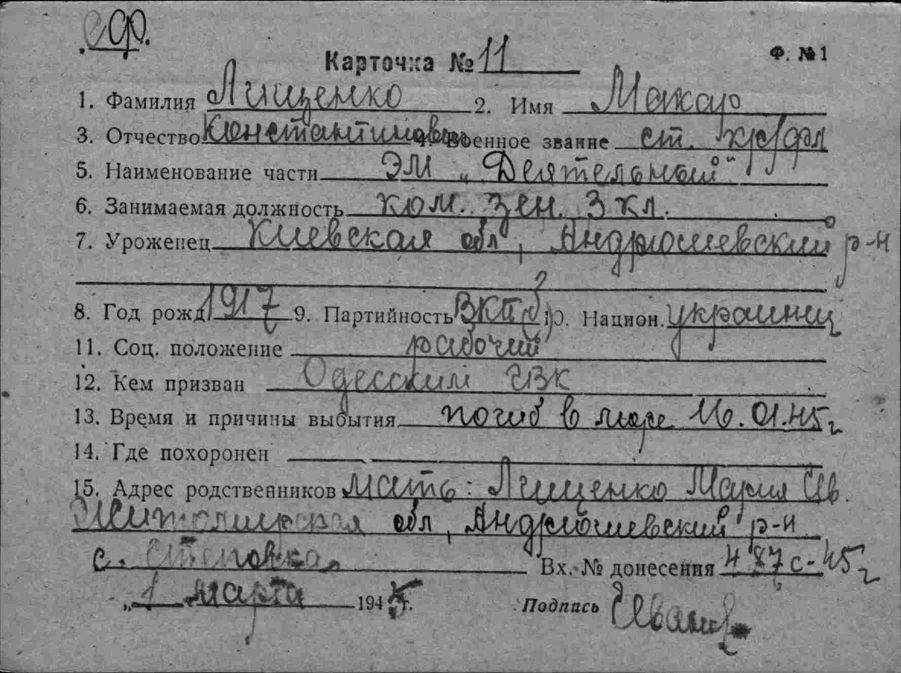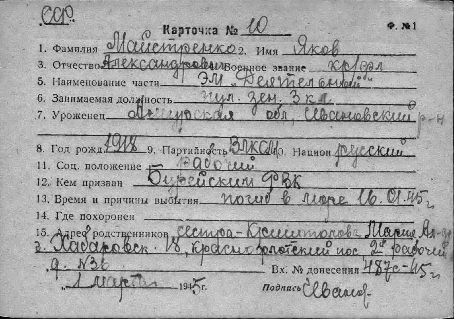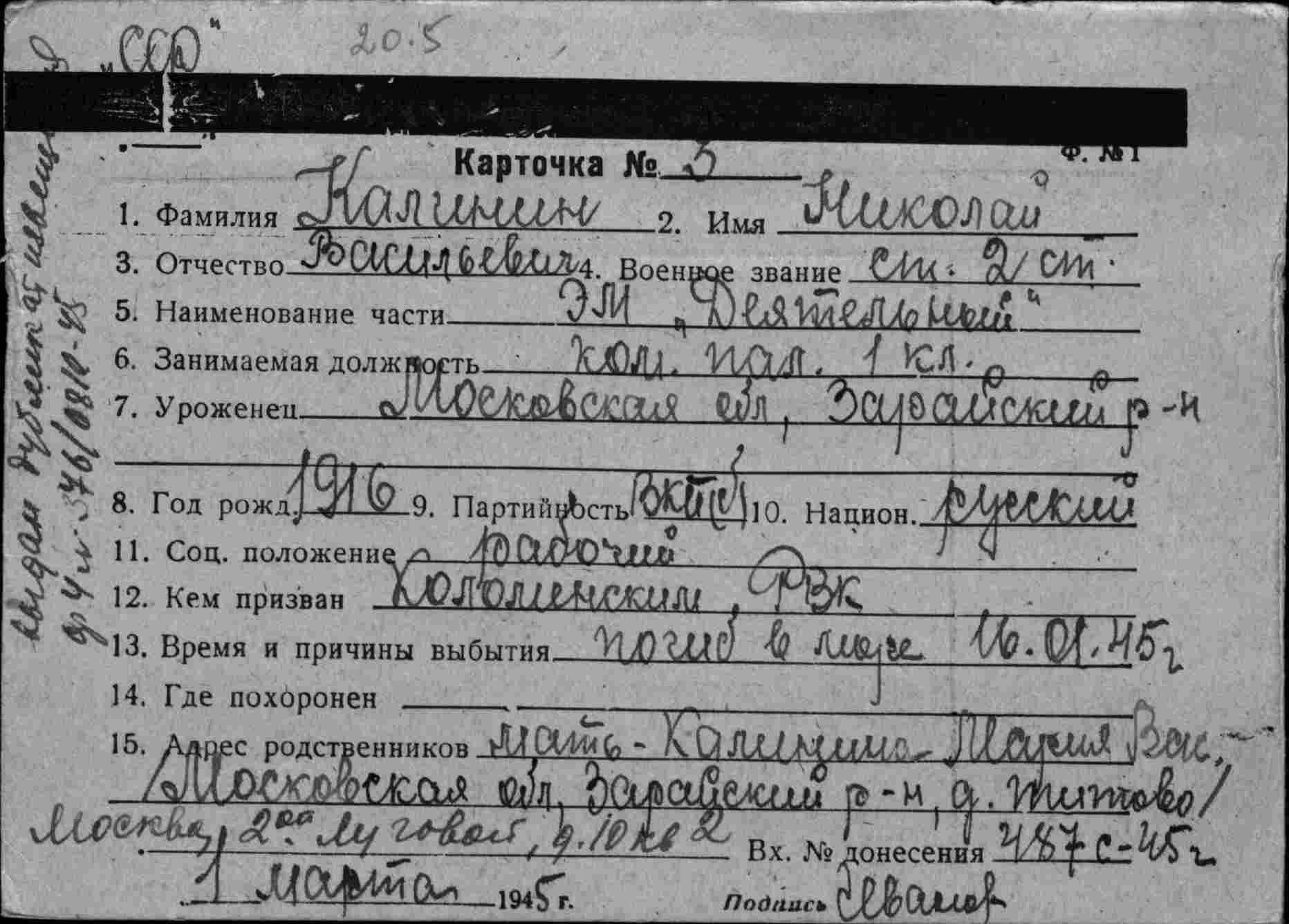 Место призыва Л.-Сталинский РВК