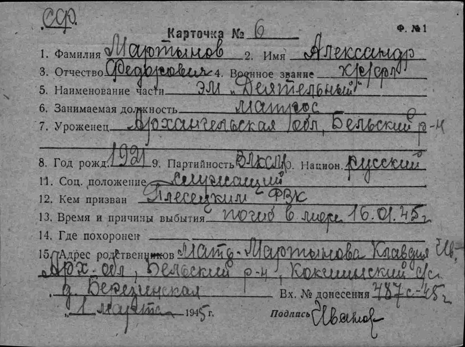 Дата выбытия 16.01.1945