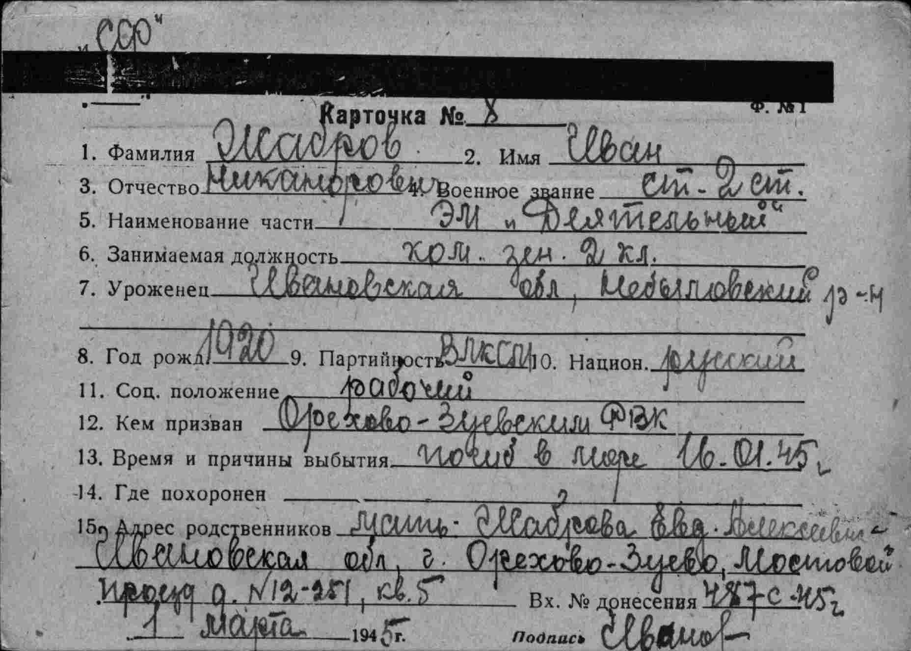 Место рождения Московская обл., Орехово-Зуевский р-н