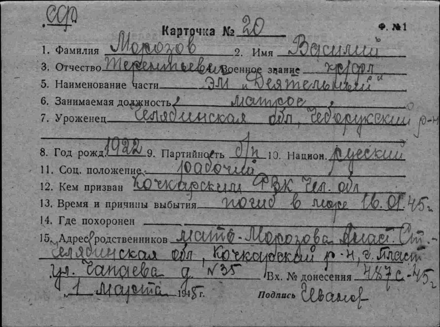 Название источника информации Картотека безвозвратных потерь