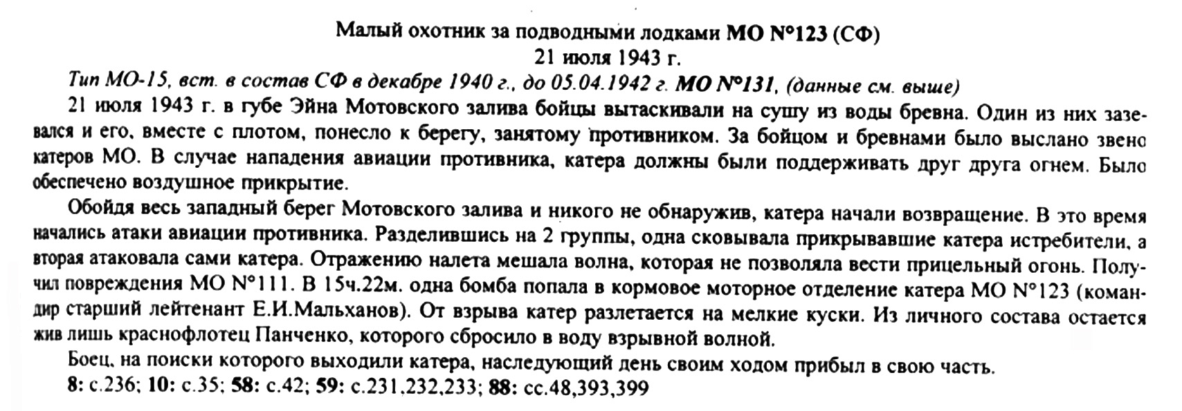 (документальные данные о ранениях и действиях экипажа МО-111 в бою см. здесь)Несмотря на мешавшую маневрам волну, катера искусно уклонялись от авиабомб, но одна из них все же угодила в машинный отсек катера МО № 124, которым командовал [233] старший лейтенант Е. И. Мальханов. Раздался сильный взрыв, и на месте маленького кораблика остались лишь щепки да масляное пятно.