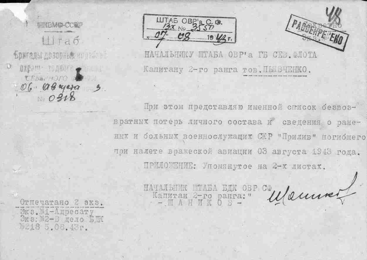 военнослужащих СКР "Прилив" погибшего при налете вражеской авиации 03 августа 1943 года.