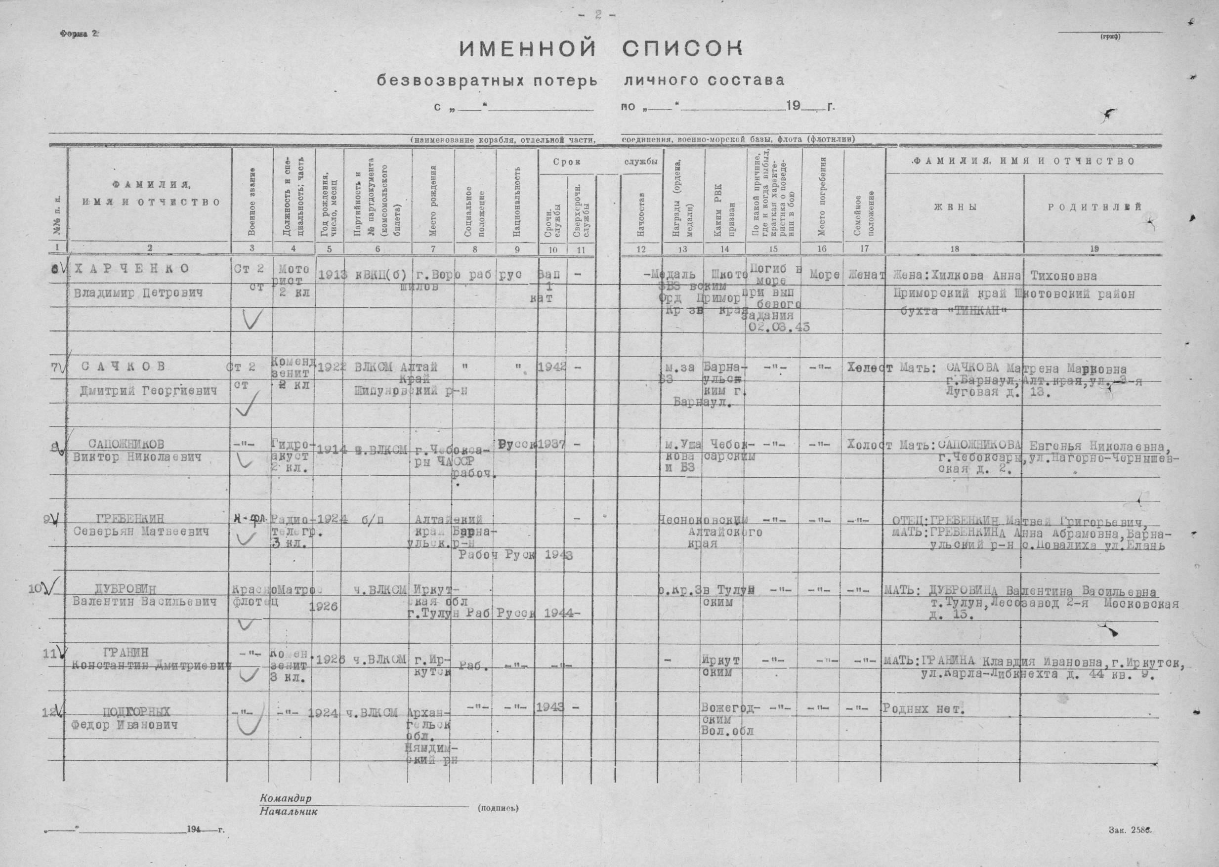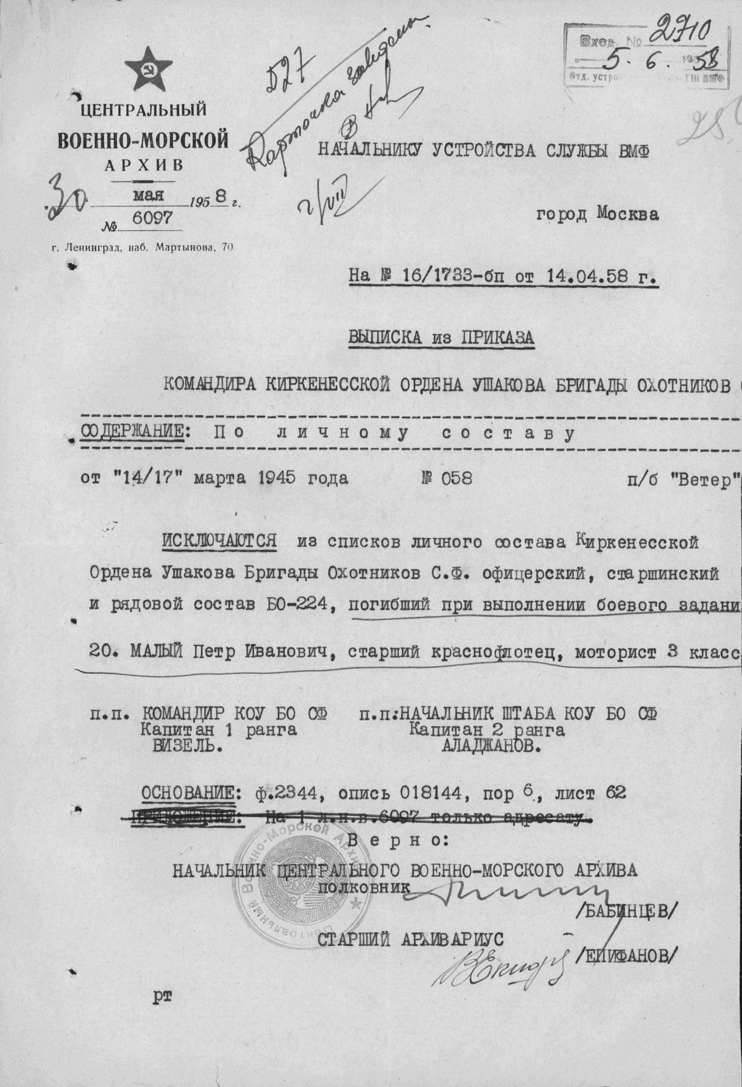 Список экипажа БО-224 и в/сл 1 ДБО погибших 2 марта 1945 года в результате торпедной атаки подводной лодки U-995