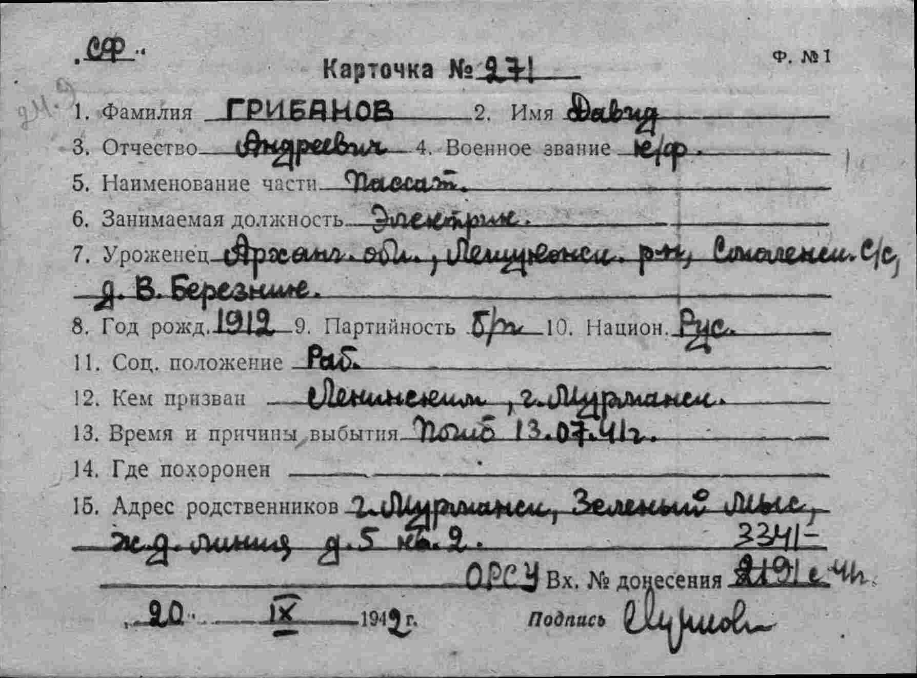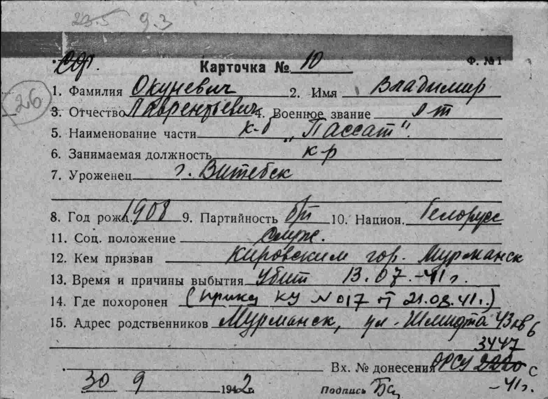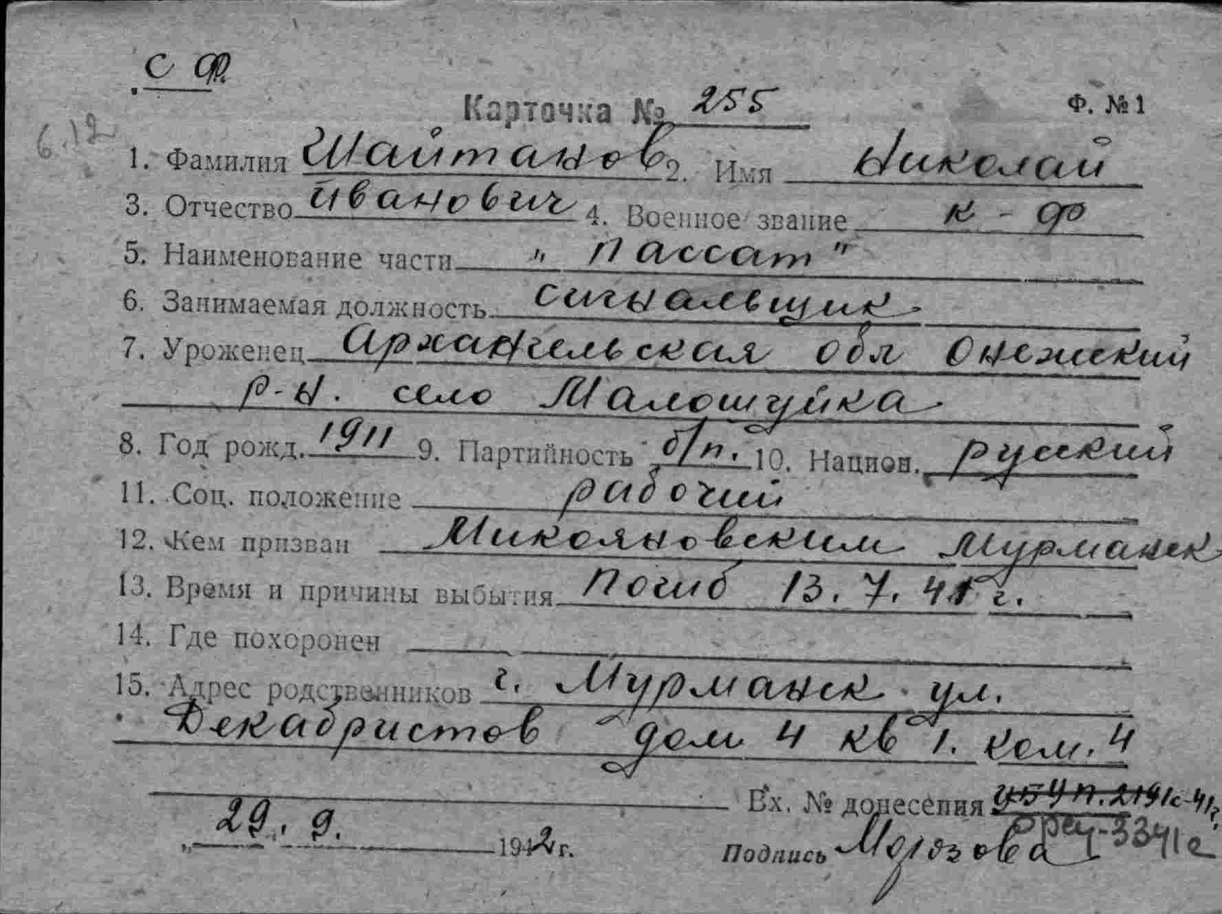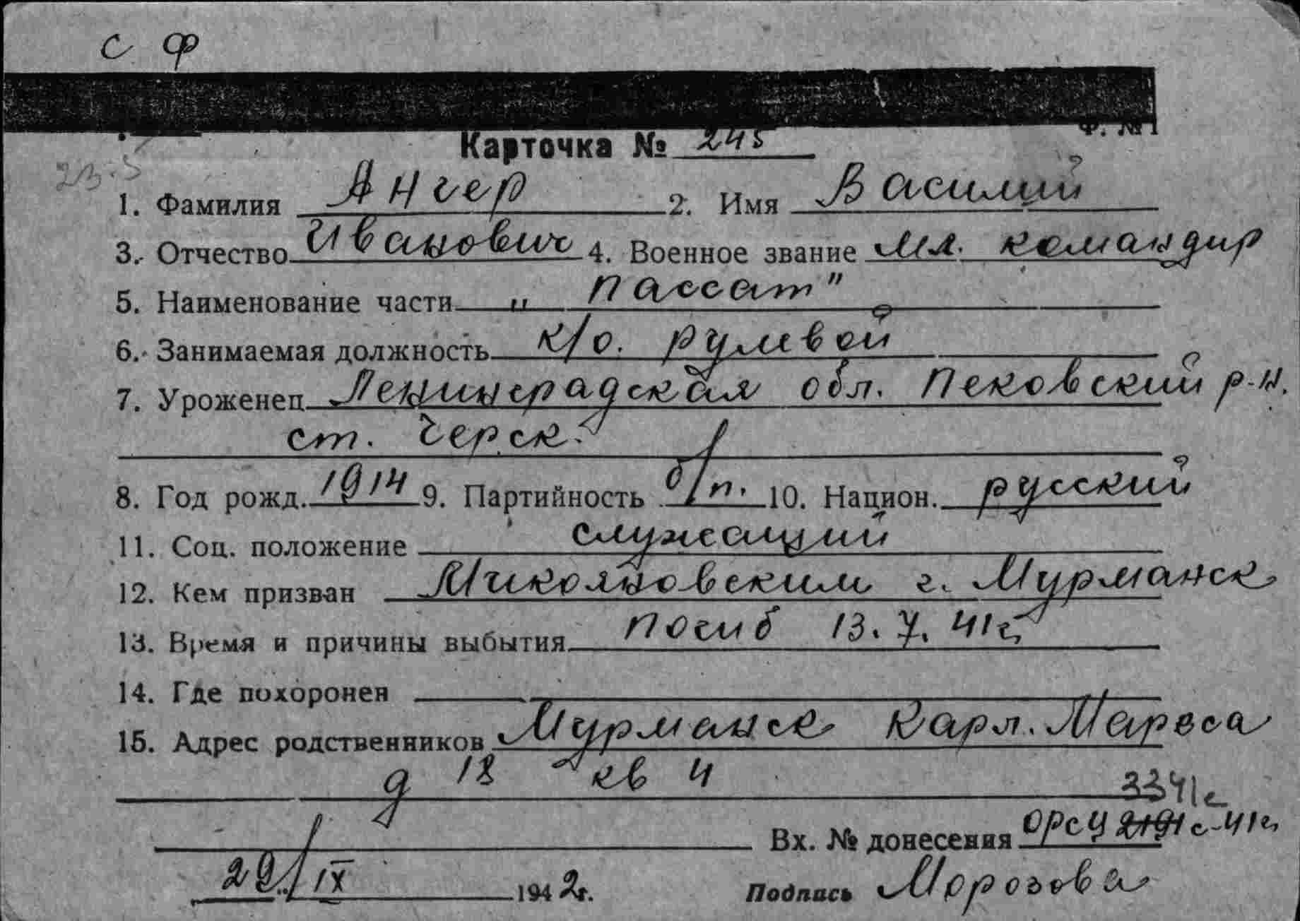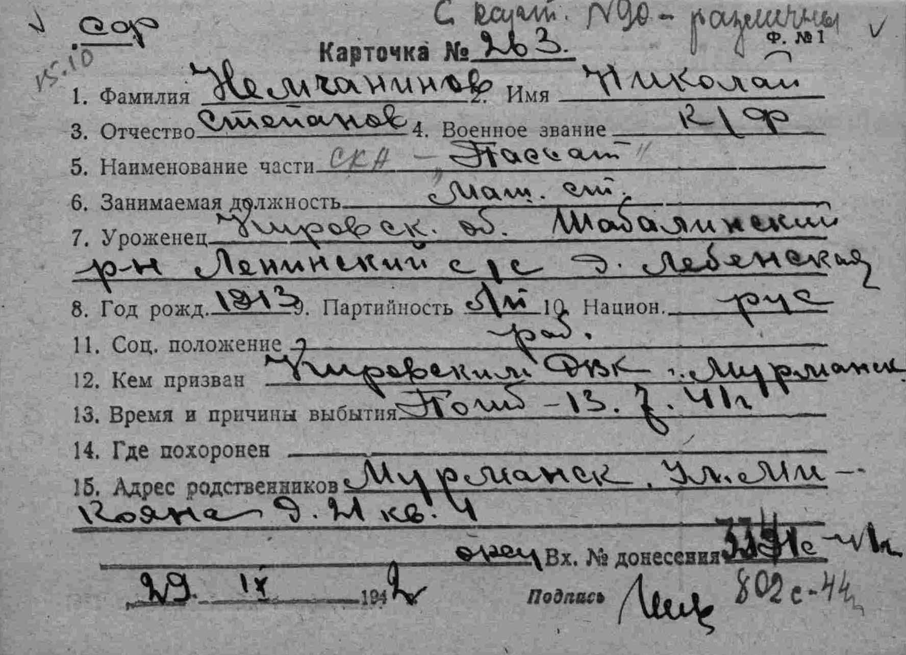 Примечание: надпись "с карт.№90 - различны" относится к однофамильцу (родственнику?) Немчанинову И.С. погибшему 20.07.1941 г. на ЭМ "Стремительный" , см.тему: http://www.polarpost.ru/forum/viewtopic ... 978#p36978