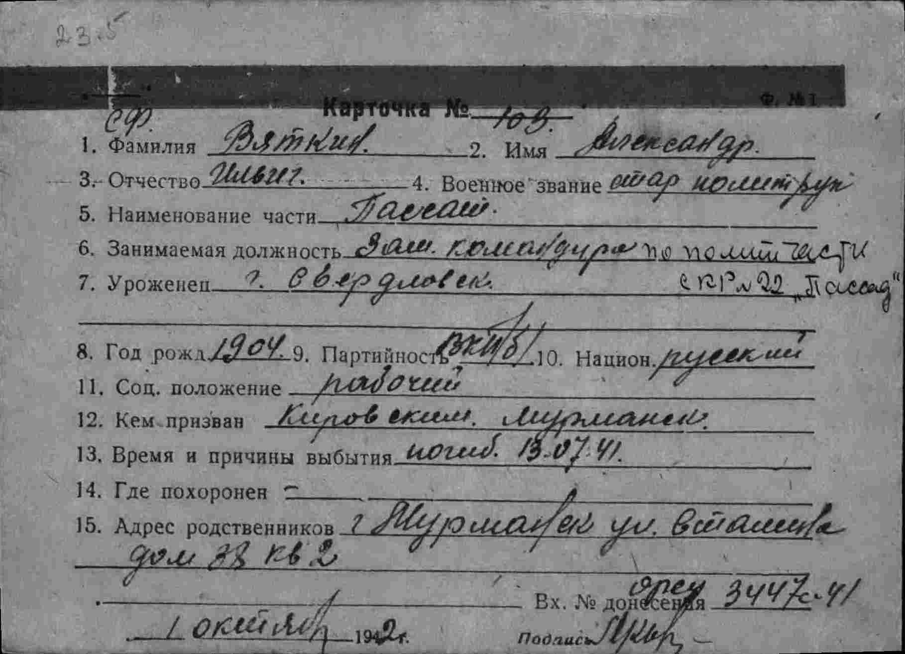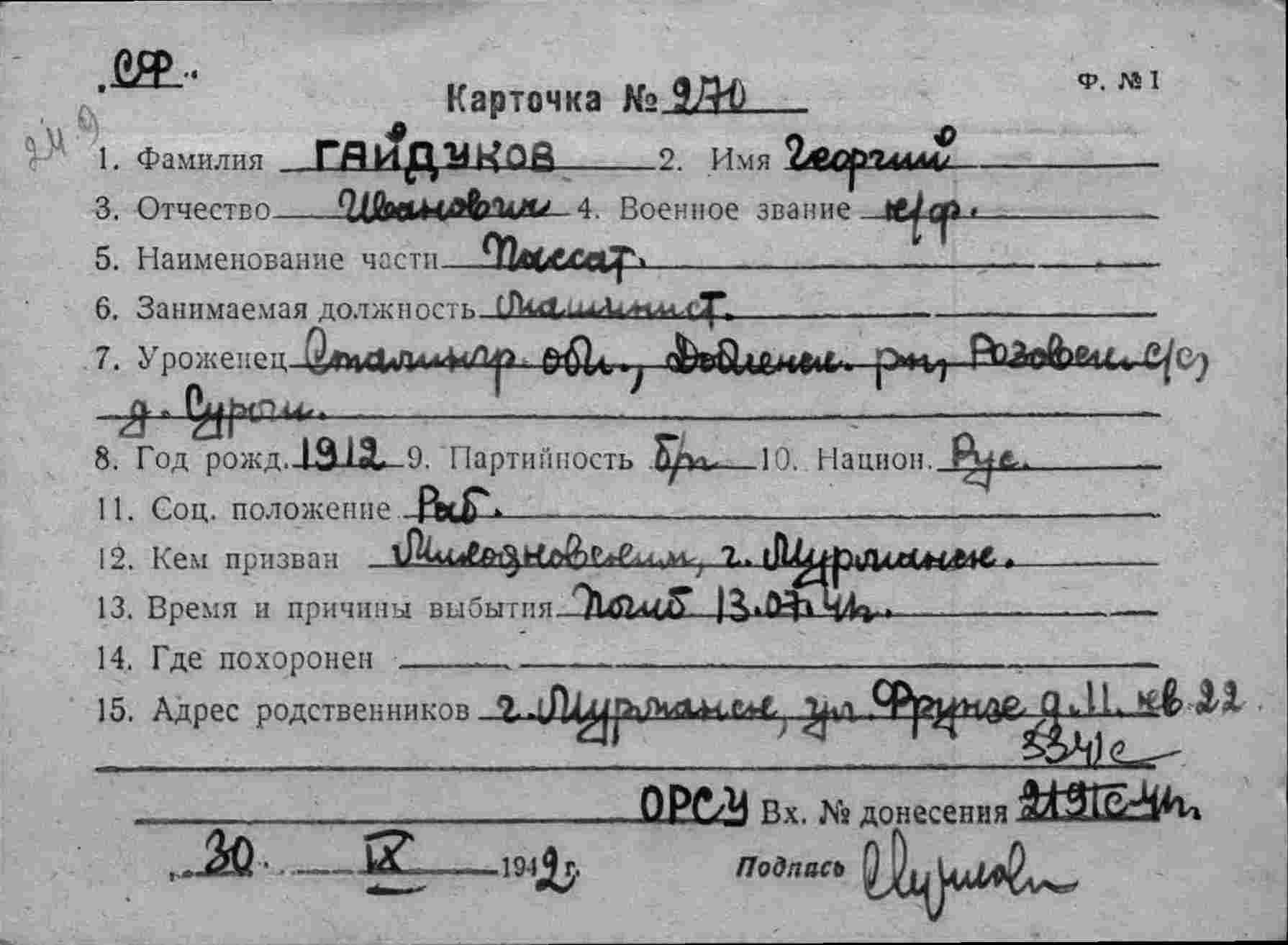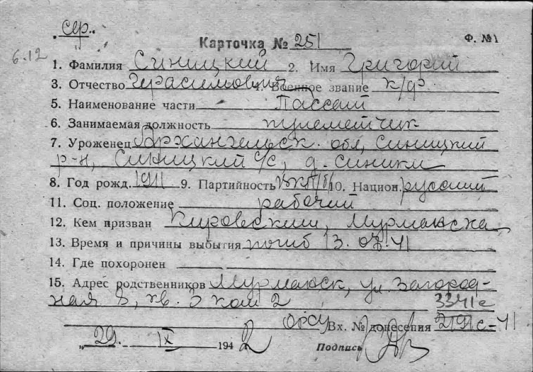 Дата и место призыва Ленинский РВК, Мурманская обл., г. Мурманск, Ленинский р-н