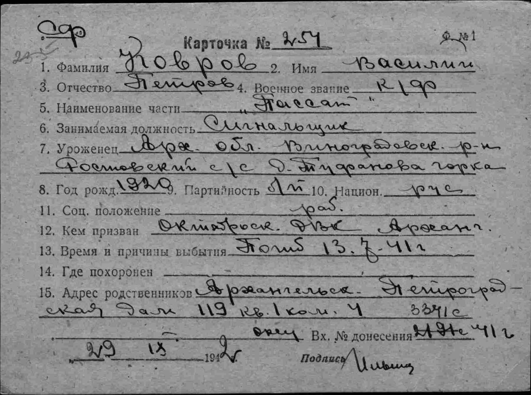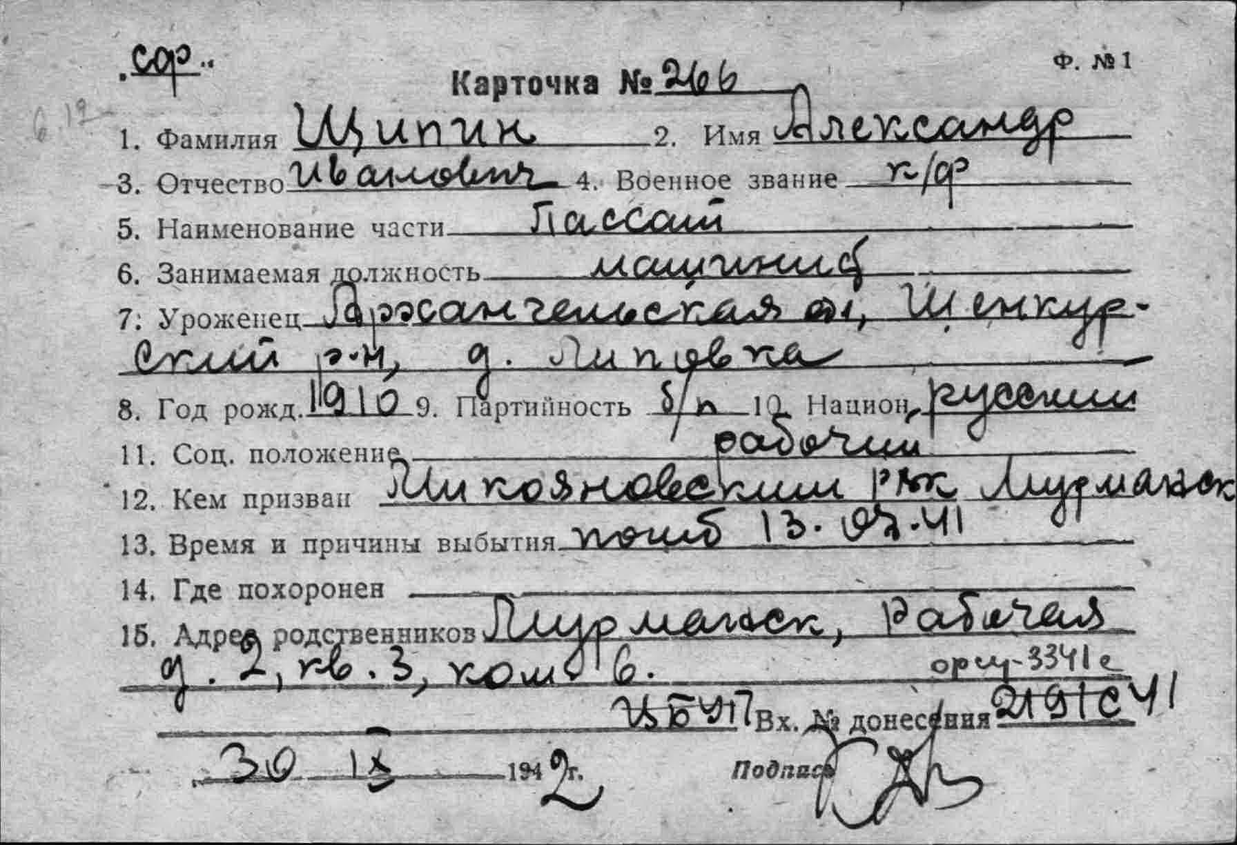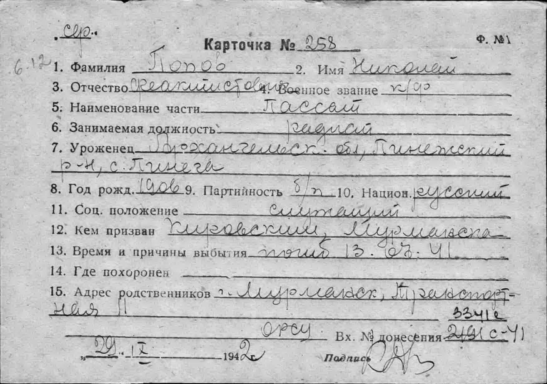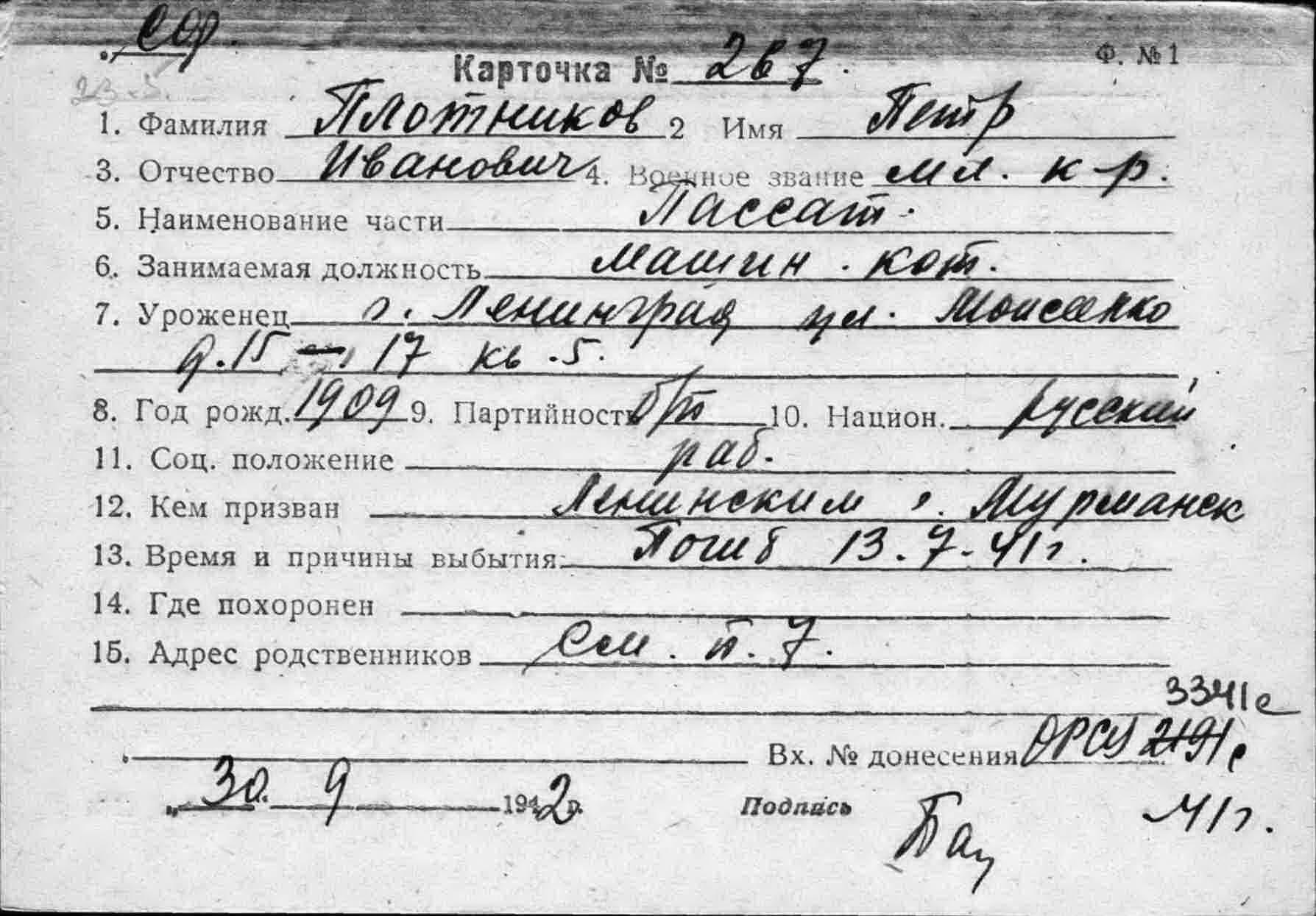 Дата и место призыва Ленинский РВК, Мурманская обл., г. Мурманск, Ленинский р-н