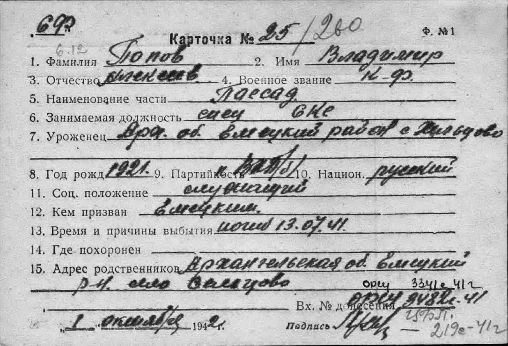 Дата и место призыва Емецкий РВК, Архангельская обл., Емецкий р-н