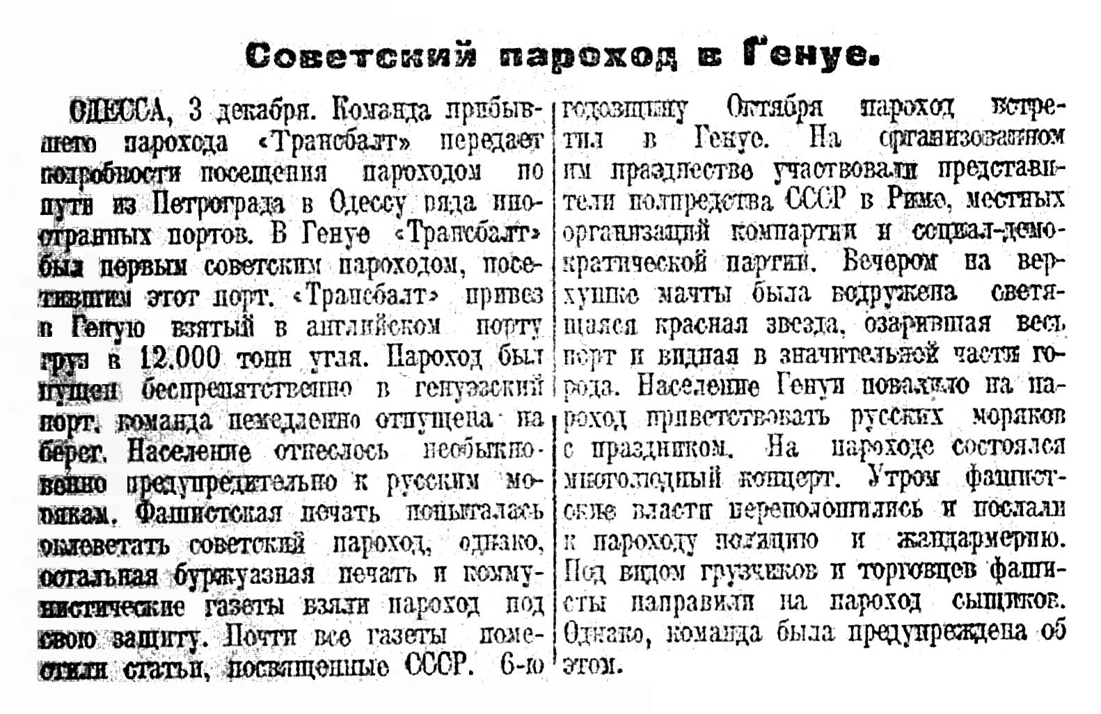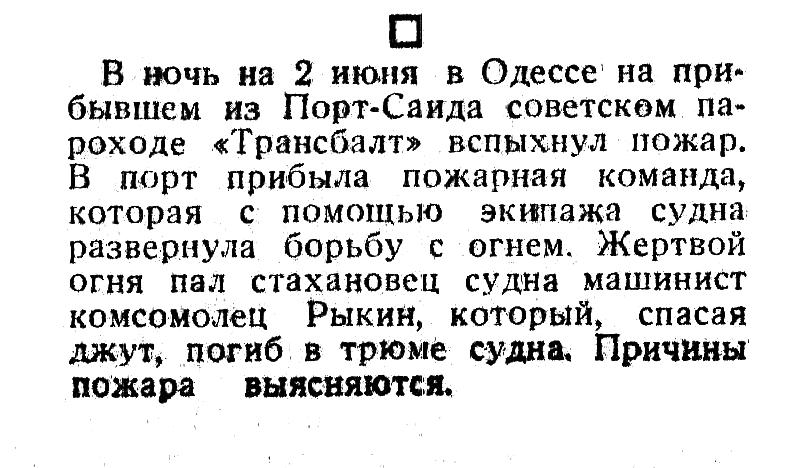 В ночь на 2 июня в Одессе на прибывшем из Порт-Саида советском пароходе «Трансбалт» вспыхнул пожар. В порт прибыла пожарная команда, которая с помощью экипажа судна развернула борьбу с огнем. Жертвой огня пал стахановец судна машинист комсомолец Рыкин, который, спасая джут, погиб в трюме судна. Причины пожара выясняются.