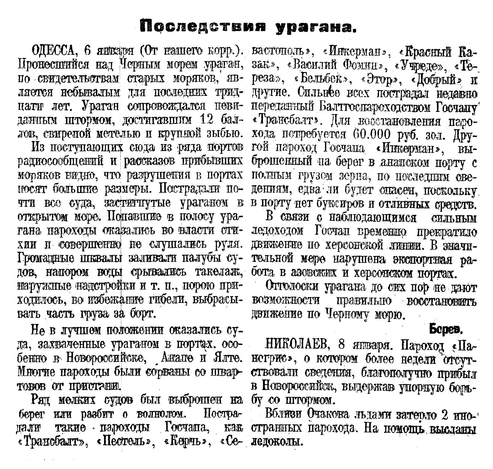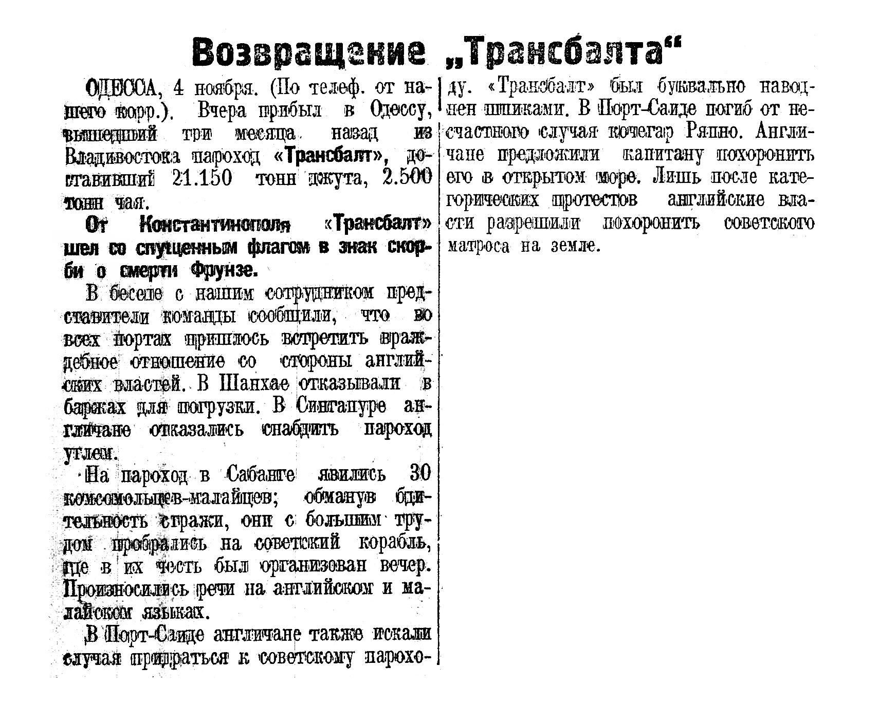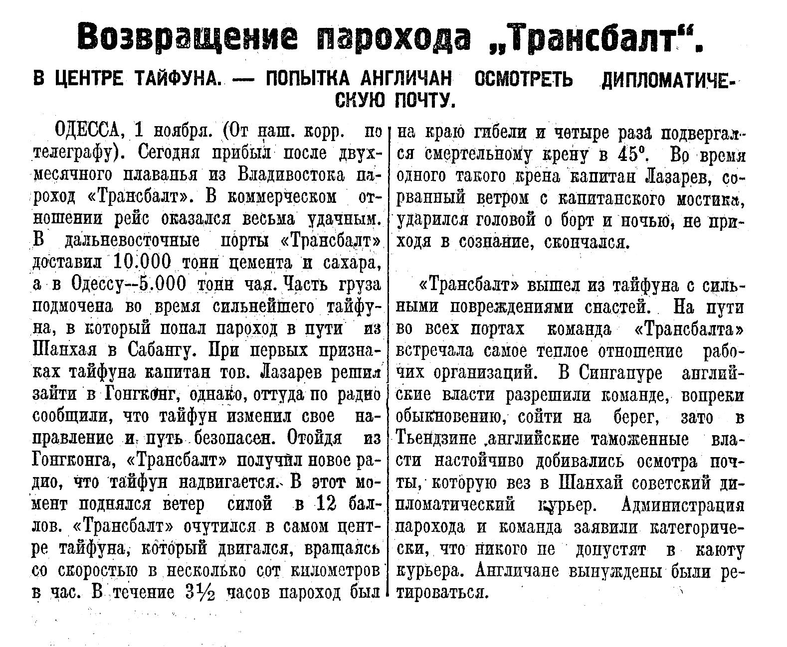 ОДЕССА, 1 ноября. (От наш. корр. по телеграфу). Сегодня прибыл после двухмесячного плаванья из Владивостока пароход «Трансбалт». В коммерческом отношении рейс оказался весьма удачным. В дальневосточные порты «Трансбалт» доставил 10.000 тонн цемента и сахара, а в Одессу — 5.000 тонн чая. Часть груза подмочена во время сильнейшего тайфуна, в который попал пароход в пути из Шанхая в Сабангу. При первых признаках тайфуна капитан тов. Лазарев решил зайти в Гонконг, однако, оттуда по радио сообщили, что тайфун изменил свое направление и, путь безопасен. Отойдя из Гонгконга, «Трансбалт» получил новое радио, что тайфун надвигается. В этот момент поднялся ветер силой в 12 баллов. «Трансбалт» очутился в самом центре тайфуна, который двигался, вращаясь со скоростью в несколько сот километров в час. В течение 3 ½ часов пароход был на краю гибели и четыре раза подвергался смертельному крену в 45°. Во время одного такого крена капитан Лазарев, сорванный ветром с капитанского мостика, ударился головой о борт и ночью, не приходя в сознание, скончался.