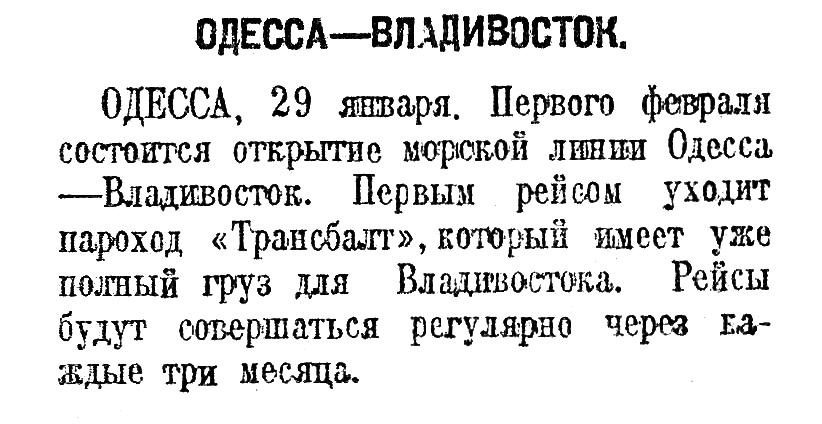 ОДЕССА, 29 января. Первого февраля состоится открытие морской линии Одесса — Владивосток. Первым рейсом уходит пароход «Трансбалт», который имеет уже полный груз для Владивостока. Рейсы будут совершаться регулярно через каждые три месяца.