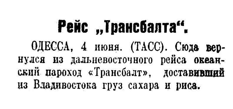 ОДЕССА, 4 июня. (ТАСС). Сюда вернулся из дальневосточного рейса океанский пароход «Трансбалт», доставивший из Владивостока груз сахара и риса.