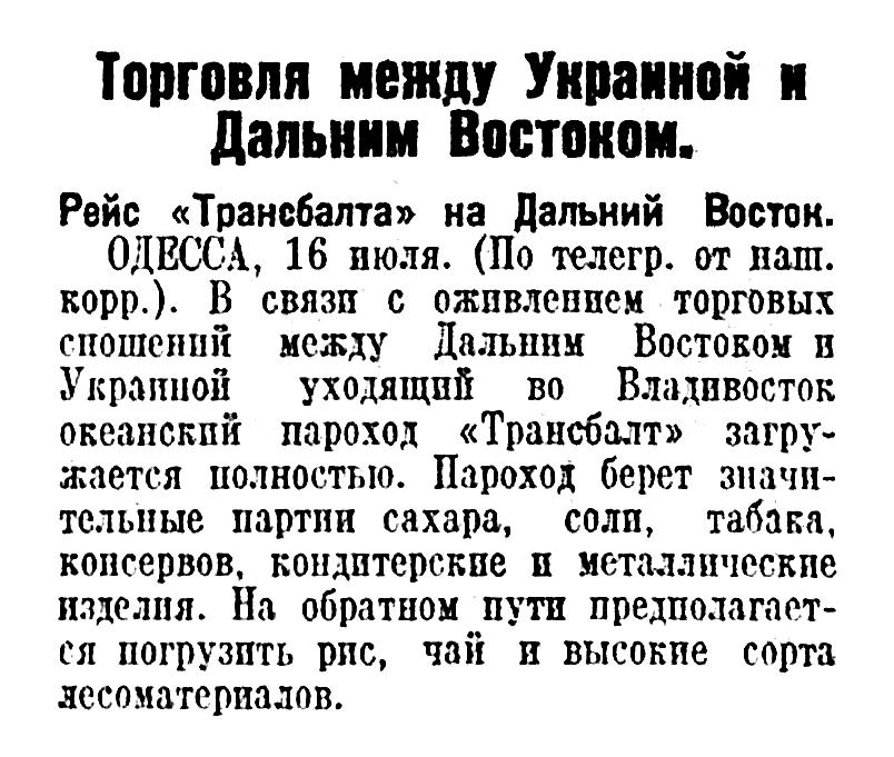 ОДЕССА, 16 июля. (По телегр. от наш. корр.). В связи с оживлением торговых сношений между Дальним Востоком и Украиной уходящий во Владивосток океанский пароход «Трансбалт» загружается полностью. Пароход берет значительные партии сахара, соли, табака, консервов, кондитерские и металлические изделия. На обратном пути предполагается погрузить рис, чай и высокие сорта лесоматериалов.