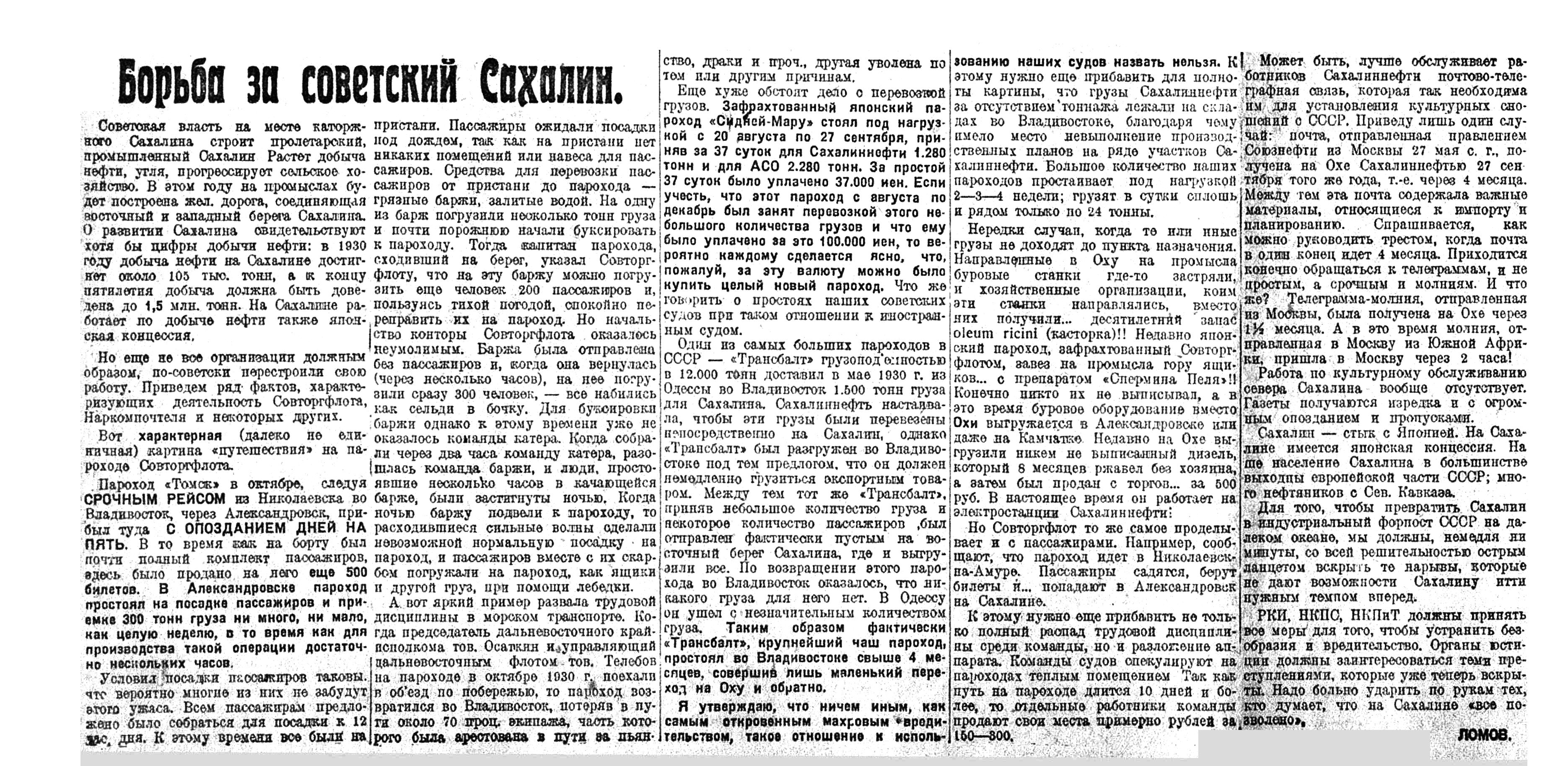 ... Один из самых больших пароходов в СССР — «Трансбалт» грузоподъемностью в 12.000 тонн доставил в мае 1930 г. из Одессы во Владивосток 1.500 тонн груза для Сахалина. Сахалиннефть настаивала, чтобы эти грузы были перевезены непосредственно на Сахалин, однако «Трансбалт» был разгружен во Владивостоке под тем предлогом, что он должен немедленно грузиться экспортным товаром. Между тем тот же «Трансбалт», приняв небольшое количество груза и некоторое количество пассажиров был отправлен фактически пустым на восточный берег Сахалина, где и выгрузили все. По возвращении этого парохода во Владивосток оказалось, что никакого груза для него нет. В Одессу он ушел с незначительным количеством груза. Таким образом фактически «Трансбалт», крупнейший наш пароход, простоял во Владивостоке свыше 4 месяцев, совершив лишь маленький переход на Оху и обратно.