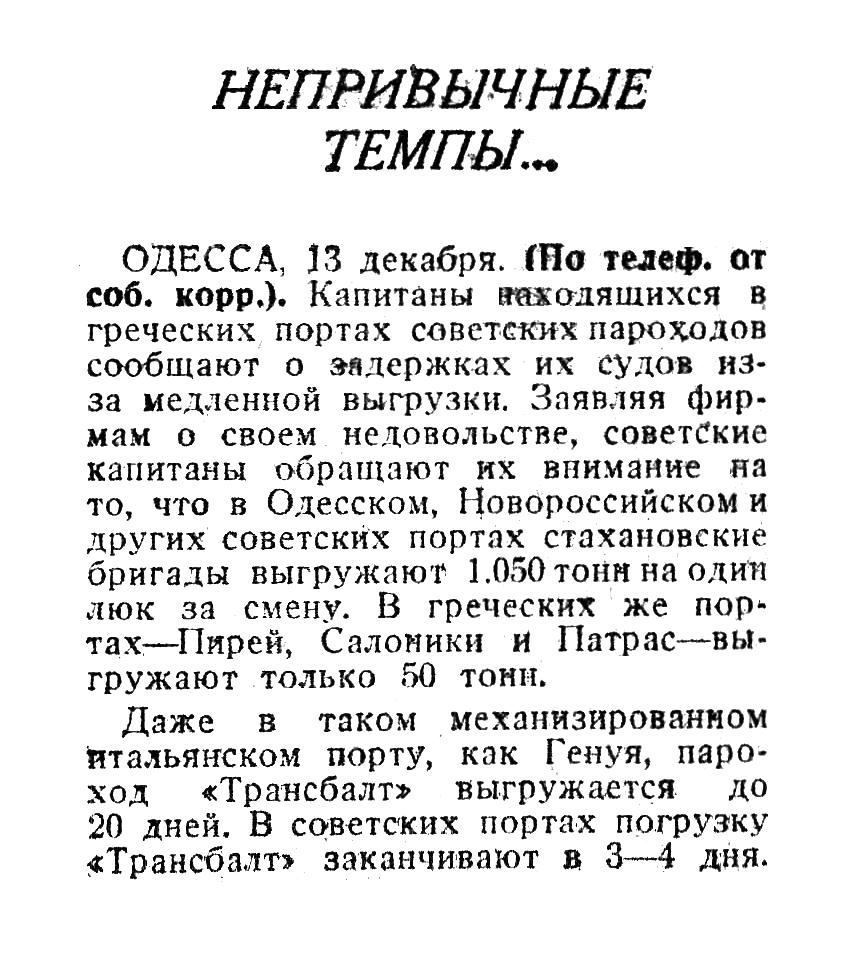 ОДЕССА, 33 декабря. (По телеф. от соб. корр.). Капитаны находящихся в греческих портах советских пароходов сообщают о задержках их судов из-за медленной выгрузки. Заявляя фирмам о своем недовольстве, советские капитаны обращают их внимание на то, что в Одесском, Новороссийском и других советских портах стахановские бригады выгружают 1.050 тонн на один люк за смену. В греческих же портах — Пирей, Салоники и Патрас — выгружают только 50 тонн.