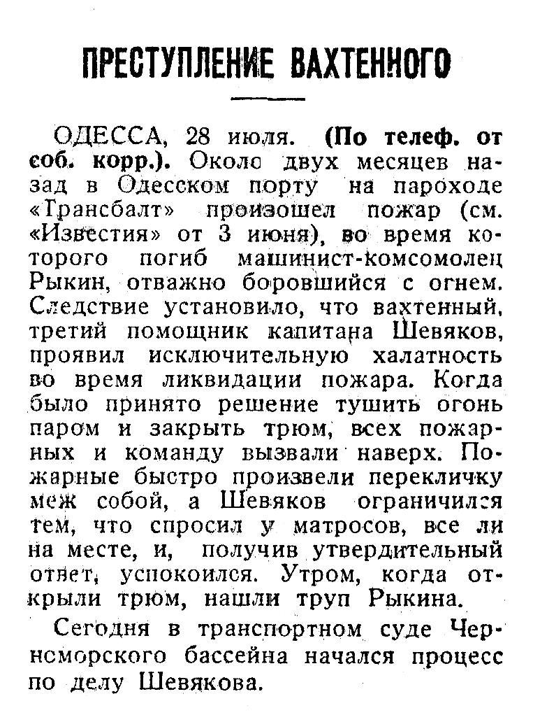 ОДЕССА, 28 июля. (По телеф. от соб. корр.). Около двух месяцев назад в Одесском порту на пароходе «Трансбалт» произошел пожар (см. «Известия» от 3 июня), во время которого погиб машинист-комсомолец Рыкин, отважно боровшийся с огнем. Следствие установило, что вахтенный, третий помощник капитала Шевяков, проявил исключительную халатность во время ликвидации пожара. Когда было принято решение тушить огонь паром и закрыть трюм, всех пожарных и команду вызвали наверх. Пожарные быстро произвели перекличку меж собой, а Шевяков ограничился тем, что спросил у матросов, все ли на месте, и, получив утвердительный ответ успокоился. Утром, когда открыли трюм, нашли труп Рыкина.
