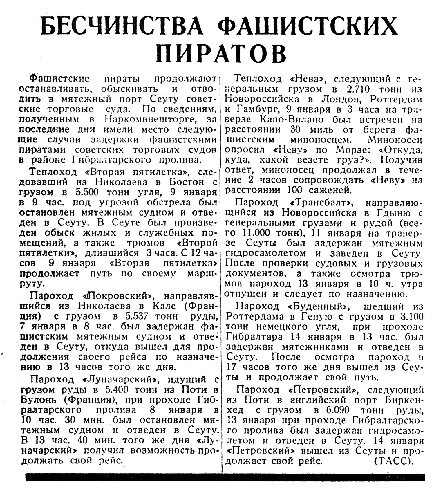 Фашистские пираты продолжают останавливать, обыскивать и отводить в мятежный порт Сеуту советские торговые суда. По сведениям, полученным в Наркомвнешторге, за последние дни имели место следующие случаи задержки фашистскими пиратами советских торговых судов в районе Гибралтарского пролива.