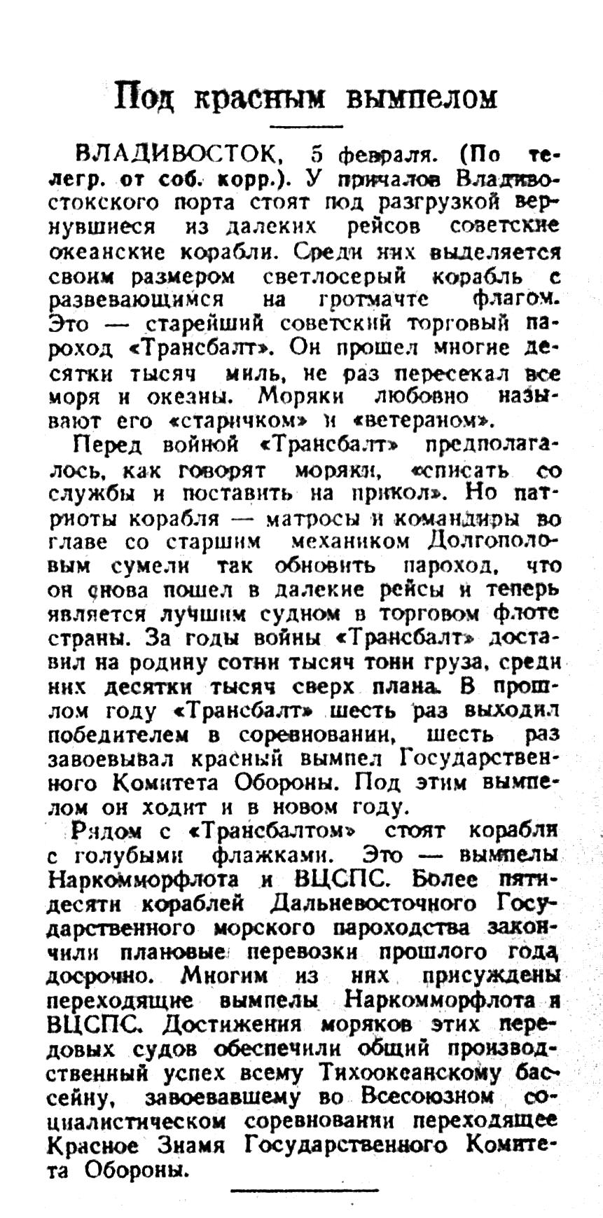 Перед войной «Трансбалт» предполагалось, как говорят моряки, «списать со службы и поставить на прикол». Но патриоты корабля — матросы и командиры во главе со старшим механиком Долгополовым сумели так обновить пароход, что он снова пошел в далекие рейсы и теперь является лучшим судном в торговом флоте страны. За годы войны «Трансбалт» доставил на родину сотни тысяч тони груза, среди них десятки тысяч сверх плана. В прошлом году «Трансбалт» шесть раз выходил победителем в соревновании, шесть раз завоевывал красный вымпел Государственного Комитета Обороны. Под этим вымпелом он ходит и в новом году.