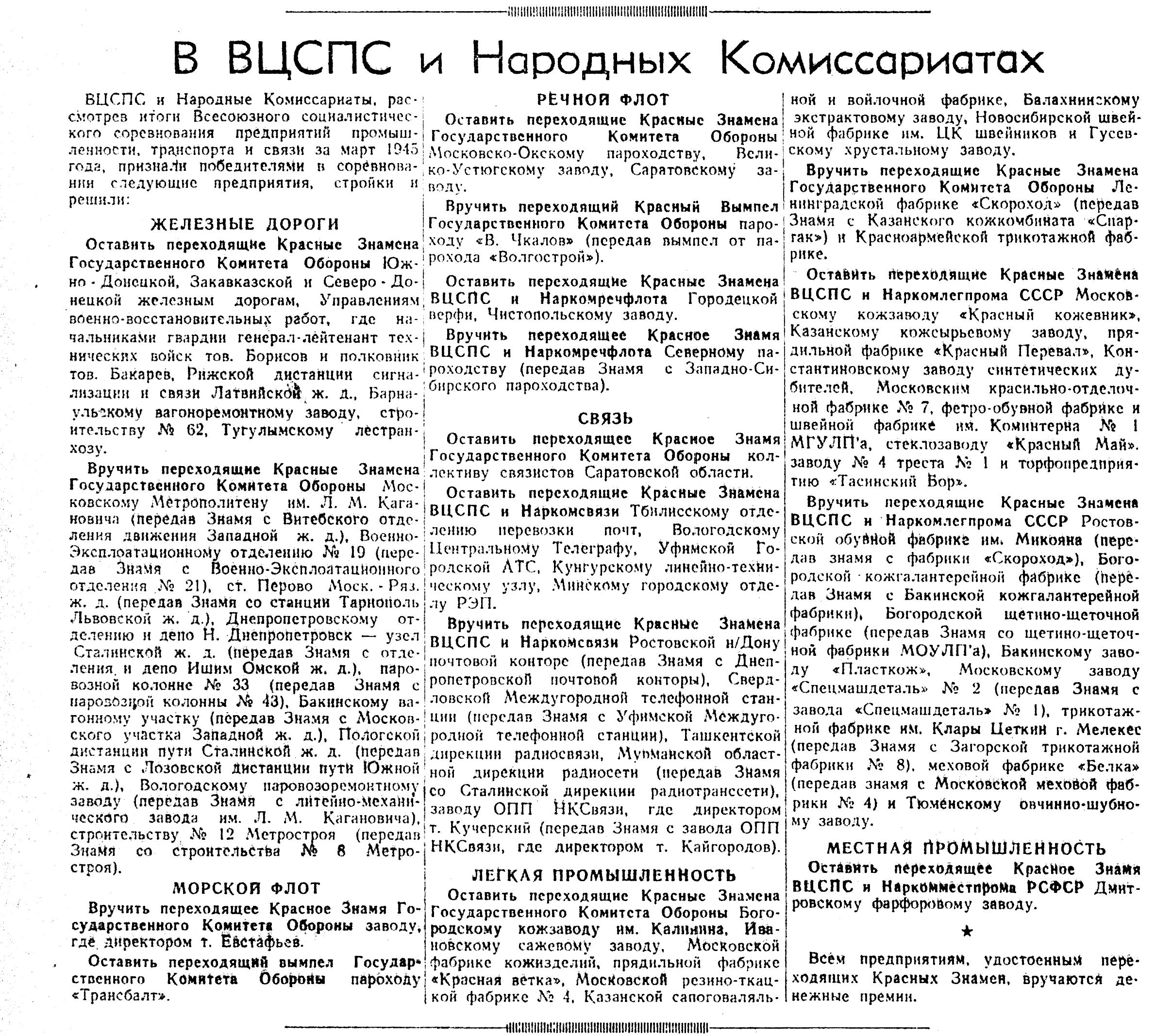 ВЦСПС и Народные Комиссариаты, рассмотрев итоги Всесоюзного социалистического соревнования предприятий промышленности, транспорта и связи за март 1945 года, признали победителями в соревновании следующие предприятия, стройки и решили: ...
