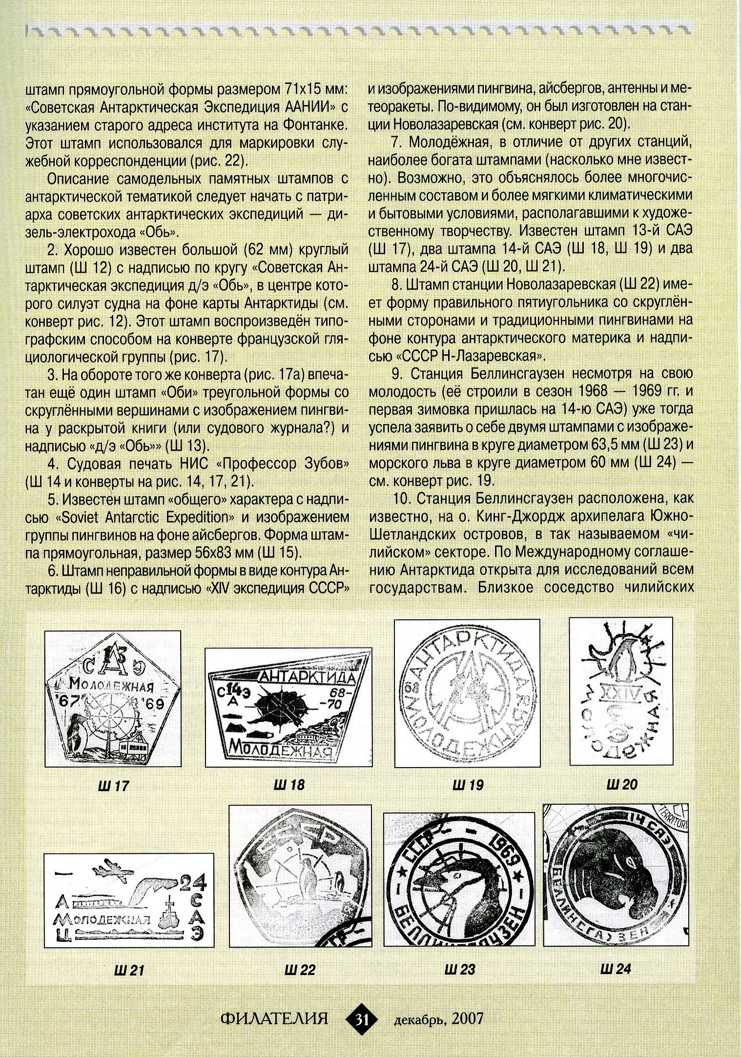 7. В. Александров. «Почтовые гашения советских научно-исследовательских станций в Антарктиде» — «Филателия СССР», 1979, № 9.