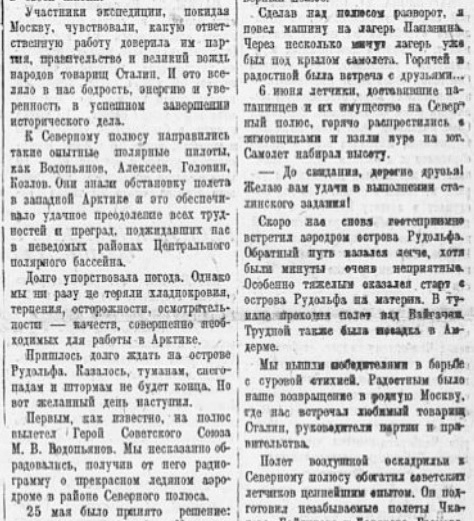 Впервые в истории человечества на Северный полюс прибыл целый коллектив — 35 отважных, отлично подготовленных полярных исследователей, ученых, авиаторов... Советские люди с честью справились с очень трудным и рискованным предприятием, сыгравшим важную роль для отечественной науки и престижа Страны Советов.