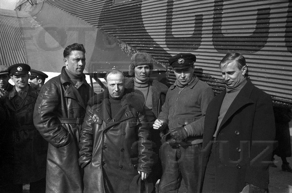 НА СНИМКЕ: участники советской экспедиции на Северный полюс: (слева направо) тт. ШЕВЕЛЕВ М. И. — зам. начальника экспедиции, ДОГМАРОВ А. А.— парторг, МАЗУРУК Н. С. (верно - И. П.) командир самолета «СССР Н—169», ГОЛОВИН П. Г. — командир разведывательного самолета «АНТ—7», СПИРИН И. Т. — флаг-штурман экспедиции, БАБУШКИН М. С. — второй пилот на флагмански корабле «СССР Н—170».