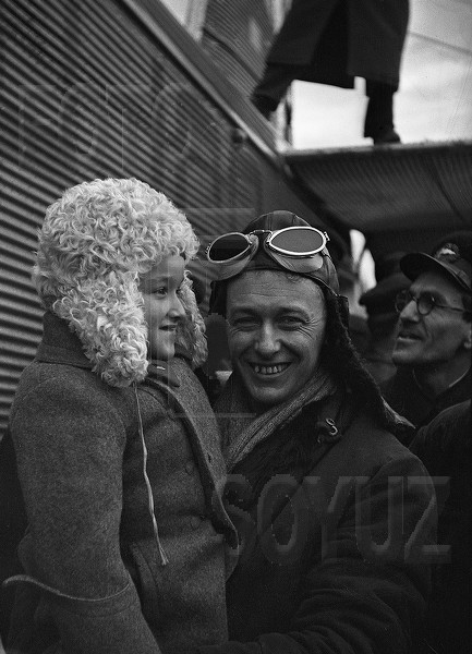 Встреча полярных летчиков И.П.Мазурука и Ф.Б.Фариха, участвовавших в высадке первой дрейфующей научной станции "Северный полюс-1". Кинооператор Роман Кармен с сыном Романом