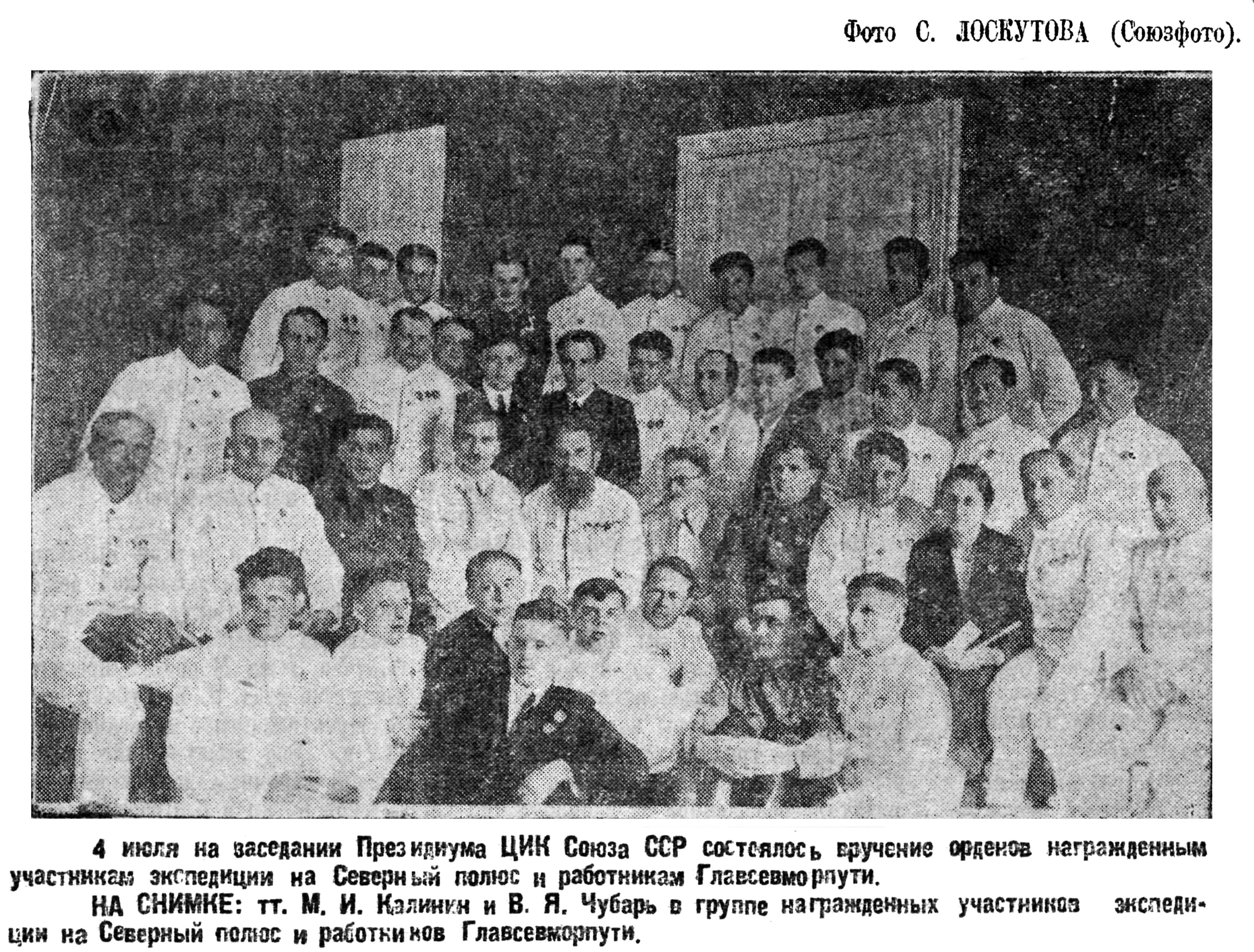 4 июля на заседании Президиума ЦИК Союза ССР состоялось вручение орденов награжденным участникам экспедиции на Северный полюс и работникам Главсевморпути.