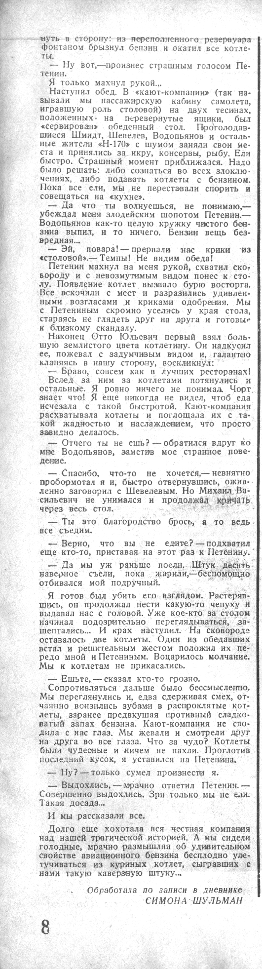 С чрезвычайным вниманием, как теперь для космонавтов, продумано и подготовлено меню полярников. Институт инженеров общественного питания переработал в 1150 кг концентратов 50 туш скота, 5500 кур, 3 т овощей. Сметана, масло, паюсная икра, сыр, шоколад и другие продукты прошли специальную обработку.